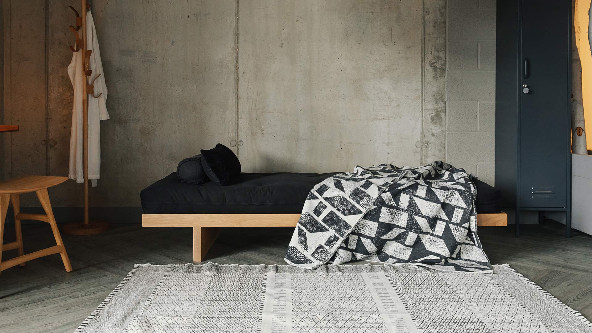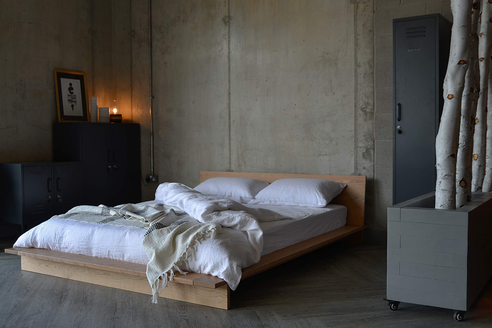 The colour palette associated with this look is either natural and neutral as above, or dramatic. Think splashes of black or crimson against ivory and white. The Kulu bed, shown below (first and third images) in solid Ash, is complemented with very simple bedding in beige and a splash of red. Set against a dark background wall, matched with dark pillowcases. The Black Oak Kulu bed shown below has a dramatic black oak headboard dressed with simple bedding in pale grey and dark blue. The ultra low bed, Kobe is shown below (right) in sanded pine with pale taupe, ivory and grey bedding. In contrast, this look offers a harmonious, calming tone to the feel of the room. Both the Kobe and Kulu looks incorporate Japanese sensibilities, and allow you to bring your own flair to tradition.