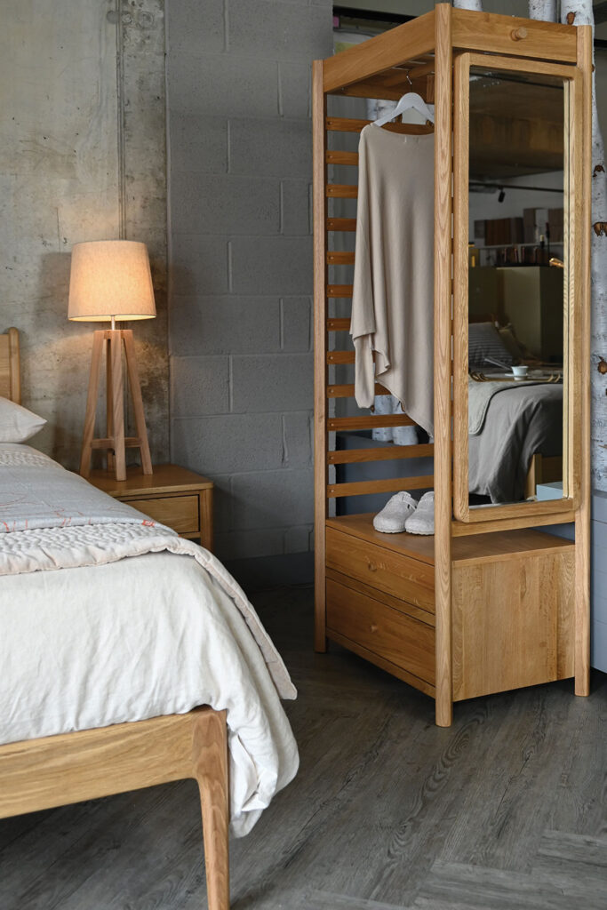 Ideally a mix of adjustable lighting and good task lighting should answer your needs. Dimmable overhead lighting will allow you to have a bright space when searching for that particular black jumper among your other black clothes (yes – I am speaking from experience!), but also allow you to create a cosy, low-light space when you want to relax. Bedside lamps to read by are both useful and stylish – angle-poise lamps or small table lamps should fit the bill.