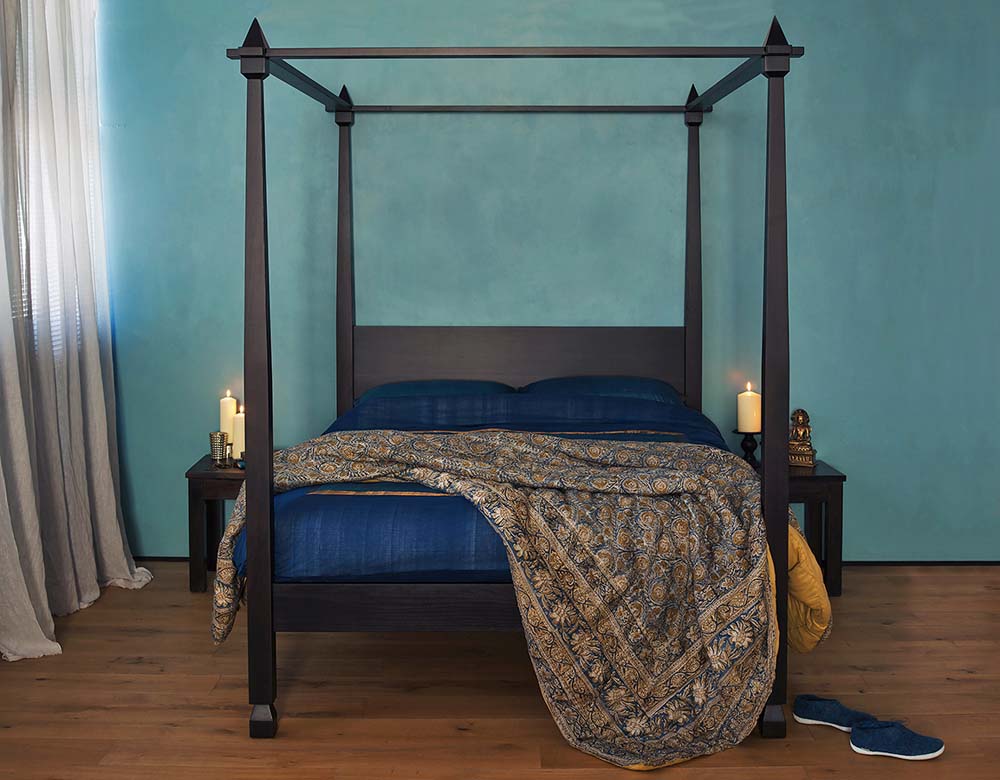 The Rajasthan four poster bed has been inspired by the shapes and motifs of Indian interior design with a western, classic colonial twist. The design concentrates on the proportions and strong shapes of eastern style, but retains a western simplicity with a plain headboard panel and chunky posts. The Raj is shown here with Indian plain and patterned bedding in deep blues and gold. The tones complement the deep aqua wall colour. A contemporary Indian silk saree has been used as a canopy and Indian crafts complete the look. The candles on the bedside tables add a little more romance to the look.