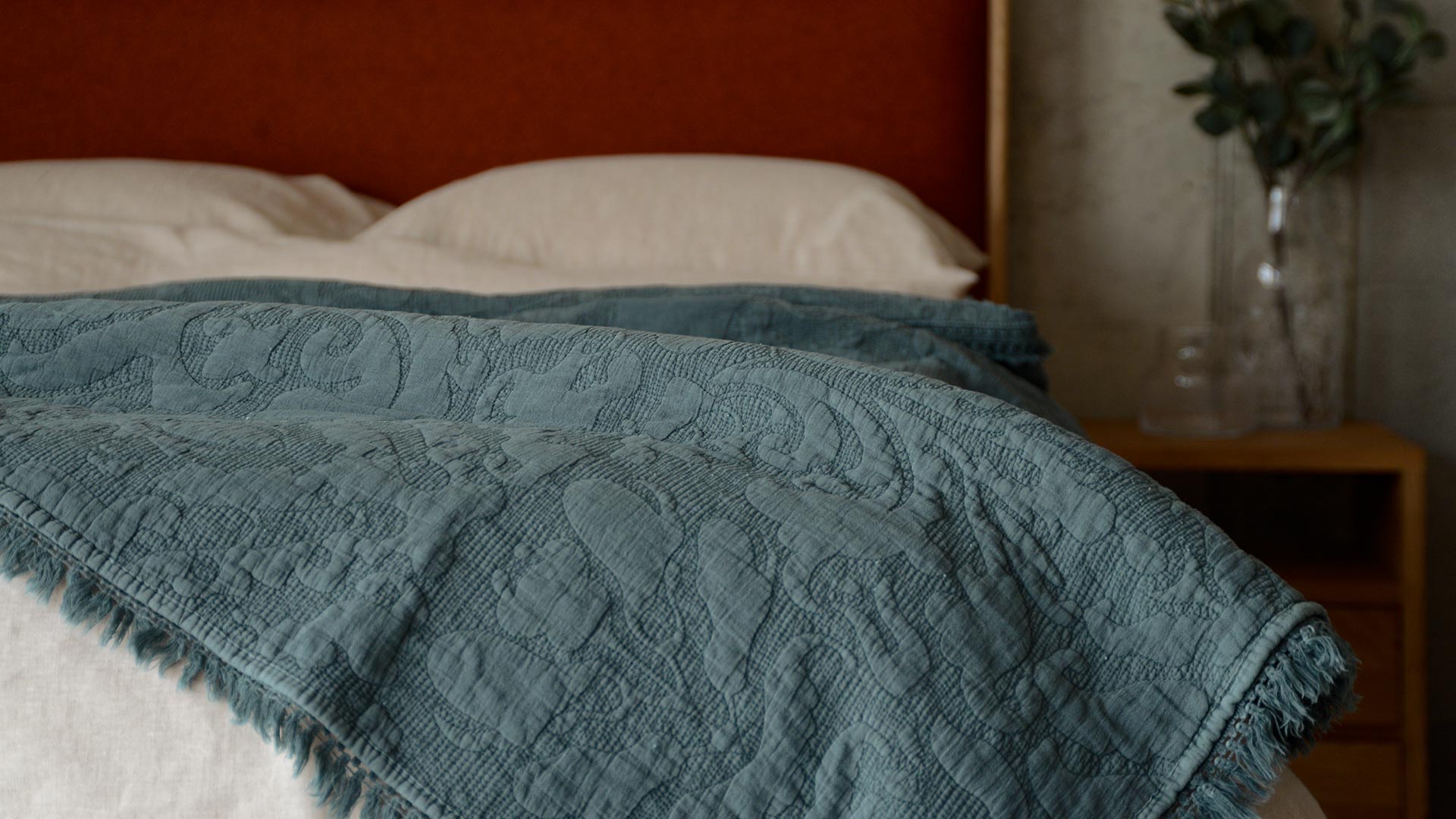 To recreate this look add a vibrant wall colour – deep turquoise, burnt orange or deep lime green are great choices (just a feature wall is fine if you are nervous of too much colour! All these shades will look great with a soft, chalky white). Wooden floors, a cotton or leather woven rug, a rustic mirror and simple, cotton bedding complete the scheme. Take a look at our Eden cotton quilts (in sage green or aqua), they are reversible with an exotic floral design to one side and a contemporary pattern to the reverse. Alternatively try our Kadi quilts – simple, stylish patchwork quilts in dusty neutrals (ember tones, earth shades and sky-blue.)