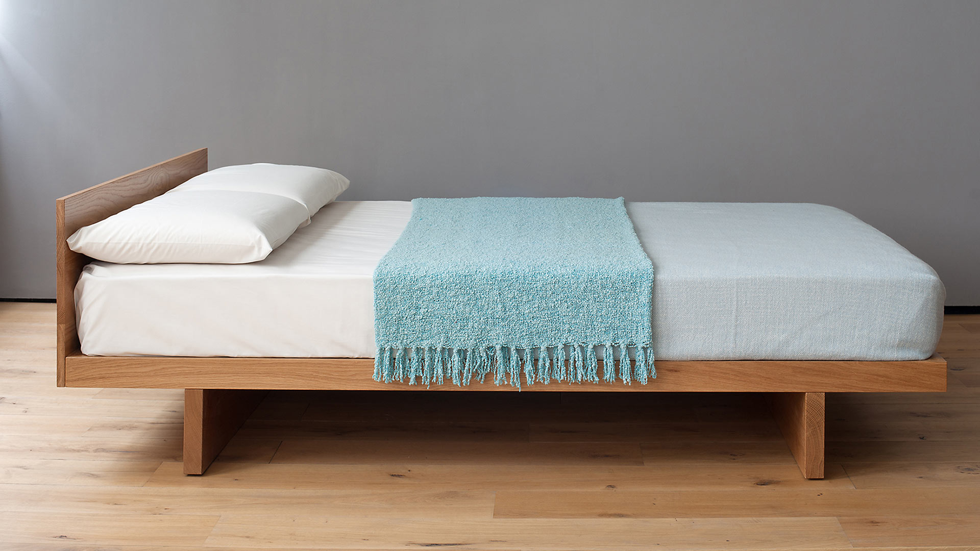 When making your timber choice with this frame, it is important to consider how much of the timber you will actually see. Once duvet covers, pillows and throws have been added into the mix, it can cover the minimal headboard. We offer the bed in two options. Without a headboard, you may only see glimpses of the timber at the footboard end and beneath the bedding.