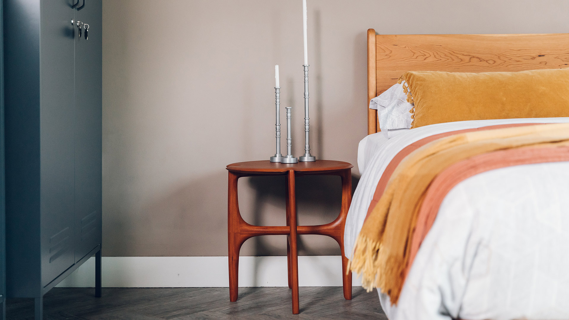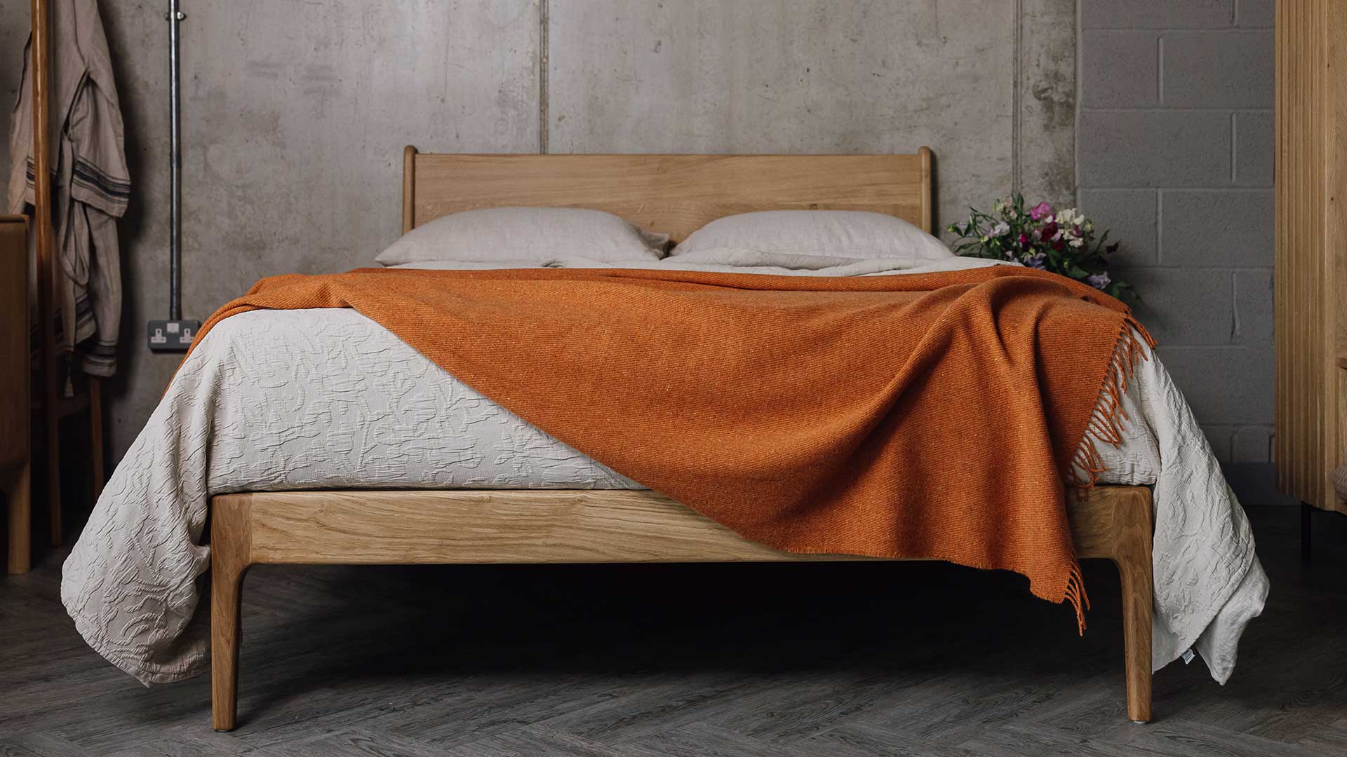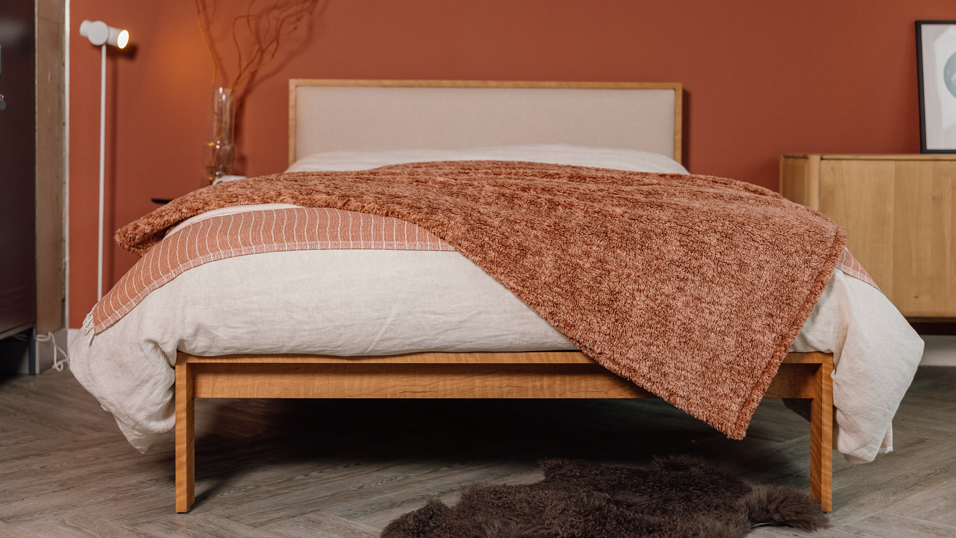 If you would prefer to add a hint of colour to the bedding take a look at the Jay Street Block Print Co. designs, especially the Ashland option, with the mix of the simple ivory background and diamond pattern in a muted salmon tone working well with the red of the cherry timber.