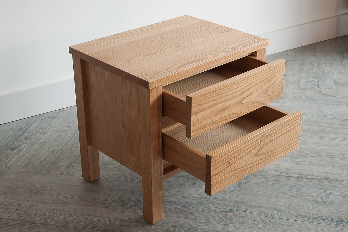 Classic Shaker Style Bedside DrawersThe Black Lotus Shaker Collection includes a large 6 drawer chest, a 5-drawer tallboy, a wide 3-drawer chest and a 2-drawer bedside chest. The 2-drawer unit in solid oak is one of our most popular choices for bedside storage.The Shaker 2-Drawer Bedside is W 50 x D 38 x H 47cm. (Additional dimensions: drawer front depth – approximately 12cm, internal drawer depth – approximately 6cm).As you can see from the images below the three drawer chest can also be used – next to our taller beds – if you are in need of lots more storage space.