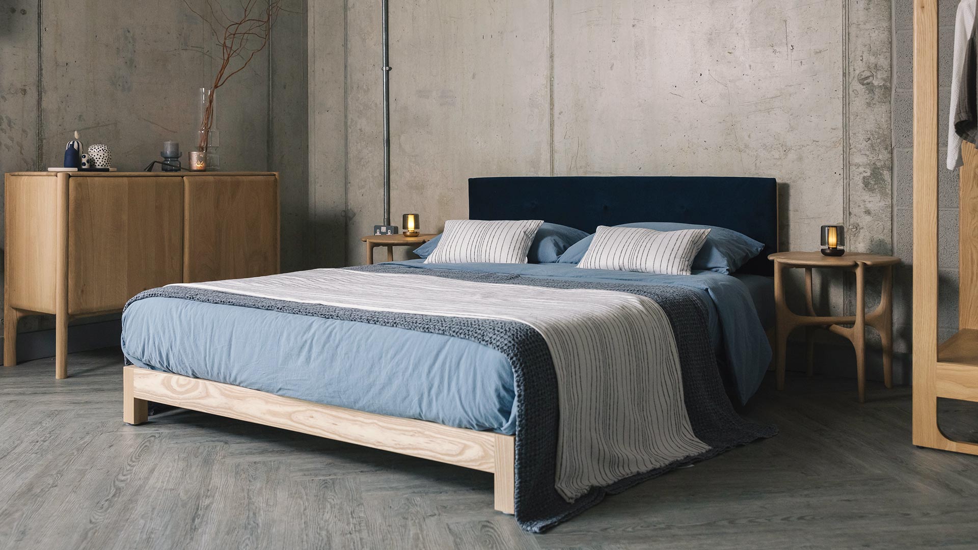 Here we will introduce you to our latest bed design – the Iona. The Iona is a very low bed with a low, solid wood base and a tall, upholstered and buttoned headboard panel. The design in inspired by our low, Sonora solid wood bed and the taller Arran bed which has a buttoned headboard. The headboard panel on the Iona isn’t quite as tall as the Arran headboard, so we’ve simplified the design – happily this is in keeping with the low, modern bed-frame.