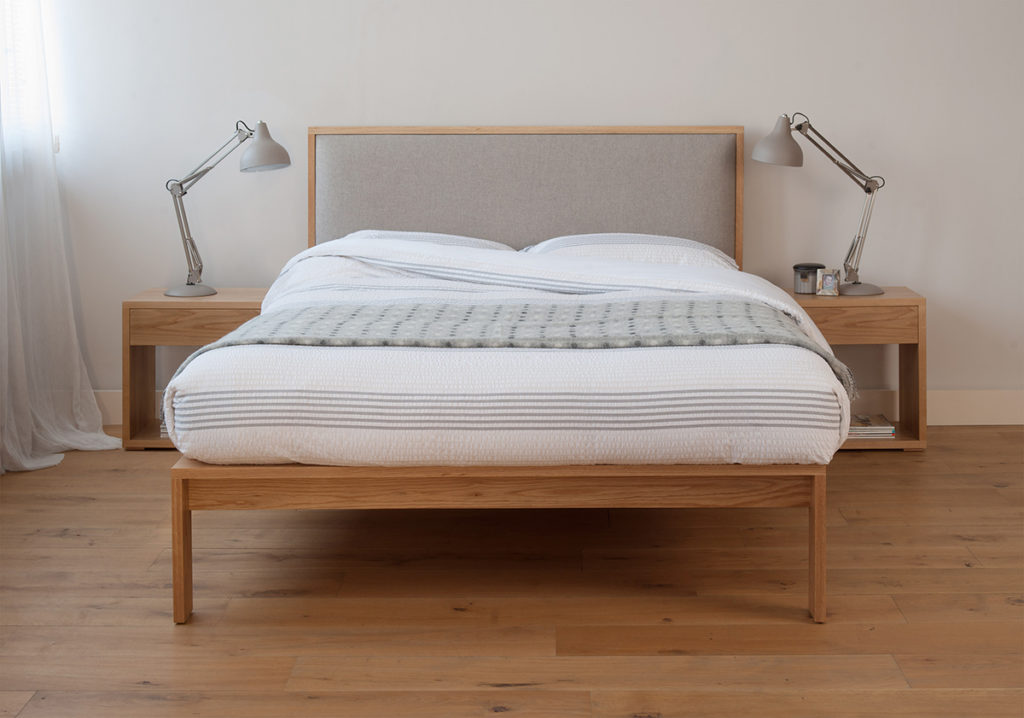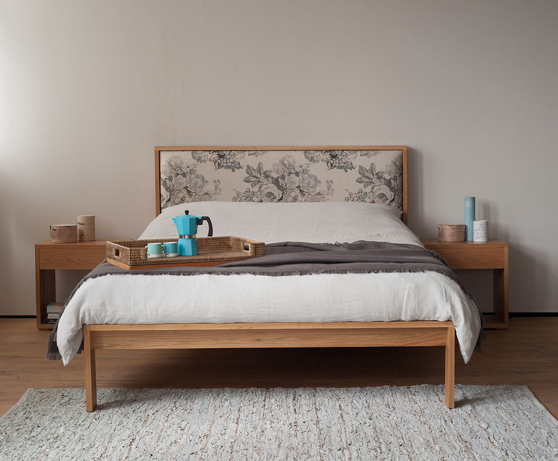 The Iona is the lowest bed base in our upholstered range and as such cannot accommodate under-bed drawers. I find either our Low Cube table or our Kyoto drawer table work well with this bed base, along with the Ethnicraft Madra low bedside drawer unit or the Ligna bedside cupboard – if you prefer a higher option to pair with the Iona.