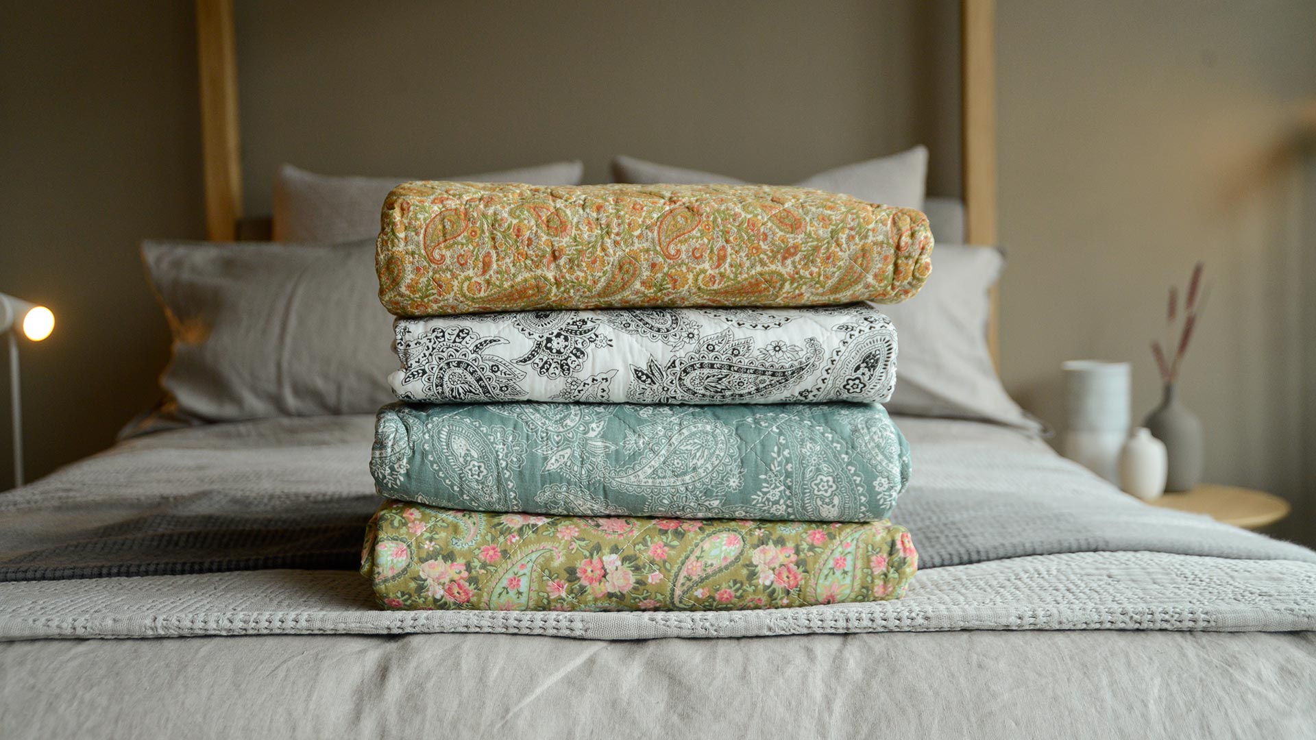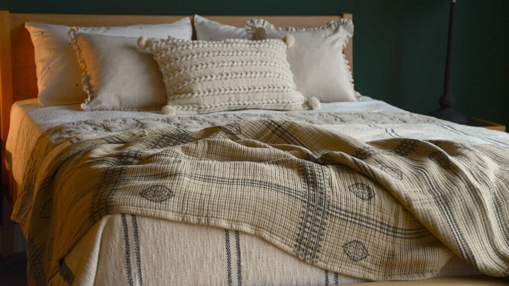 If you prefer something a little more formal try simple white cotton bedding (if you change looks later – this bedding will go with anything!) and add texture with a knitted throw or a quilted bedspread. Complete the look with a rustic lantern, driftwood picture frame or cover a small tray with candles in aqua and ivory.