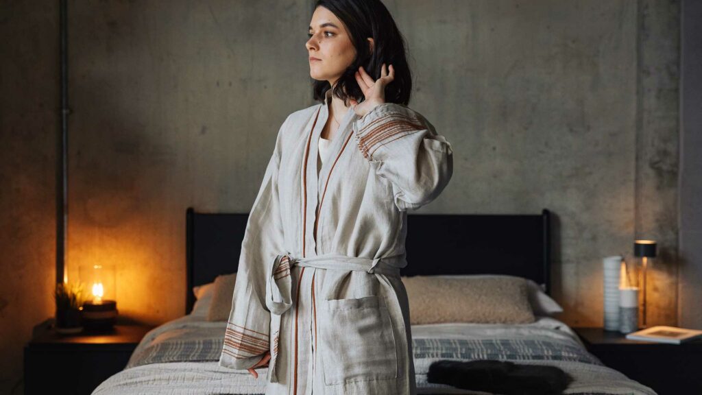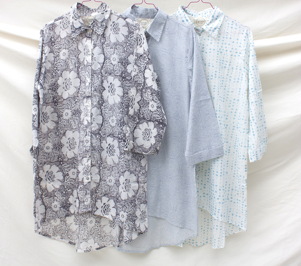 We also have a collection of linen lounge-wear and robes. The soft linen slouch dresses are in a lovely heavy weight linen in black or white, they have a loose, relaxed cut. Complete your comfort with a pair of slippers – the Glerups range are made using thick felted wool with a nubuck sole, they are available in a range of colours, with or without a heal. We also have fine cotton slippers and Moroccan leather slip-on shoes.