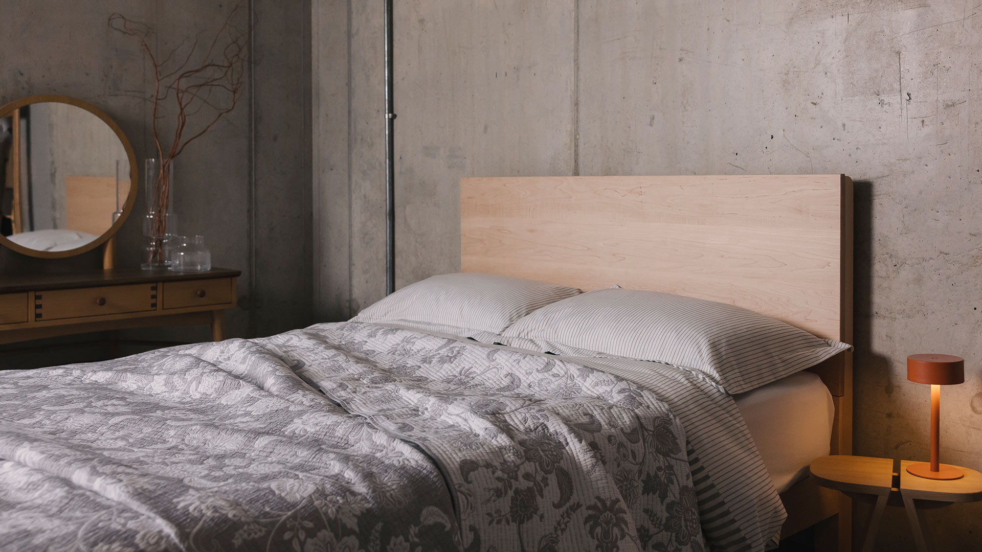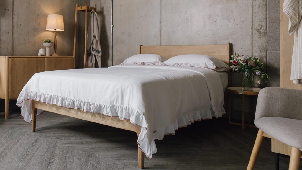 The cooler lavender-grey and soft mint tones will also look good with walnut, but also offer a nice contrast against the warmer tones of oak, cherry and ash. See our Iona and Malabar beds above with soft mint green and teal bedding, both beds are in oak (the Iona has an upholstered headboard in a subtle petrol and ivory basket-weave, wool fabric.)