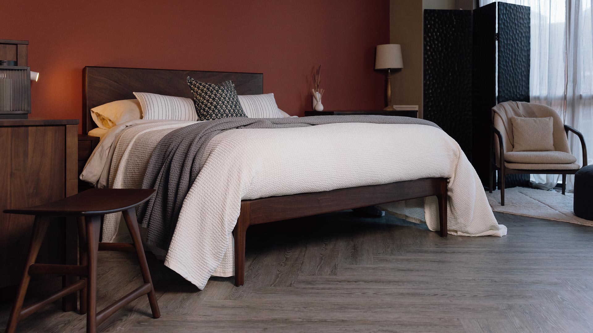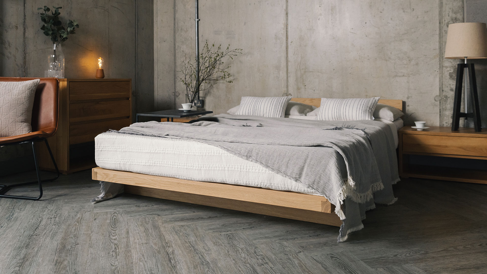 This look is all about natural materials featuring natural patterning – the swirls and stripes in marble, the knots and grain of solid wood. To incorporate this look in a bedroom scheme we would of course recommend a solid wood bed! For a timber with a rich, vibrant grain try ash, cherry or walnut. Ash is a pale golden colour with deeper stripes and swirls in a golden brown, cherry wood incorporates warm reddish tones but can also incorporate areas of cooler creamy, green shades. Walnut is a deeper chocolate brown colour with an espresso brown grain, but again areas of paler sapwood can appear. The beauty of solid wood is the natural variability of timber – knots, sapwood and burrs – all add to the individuality of wood furniture.