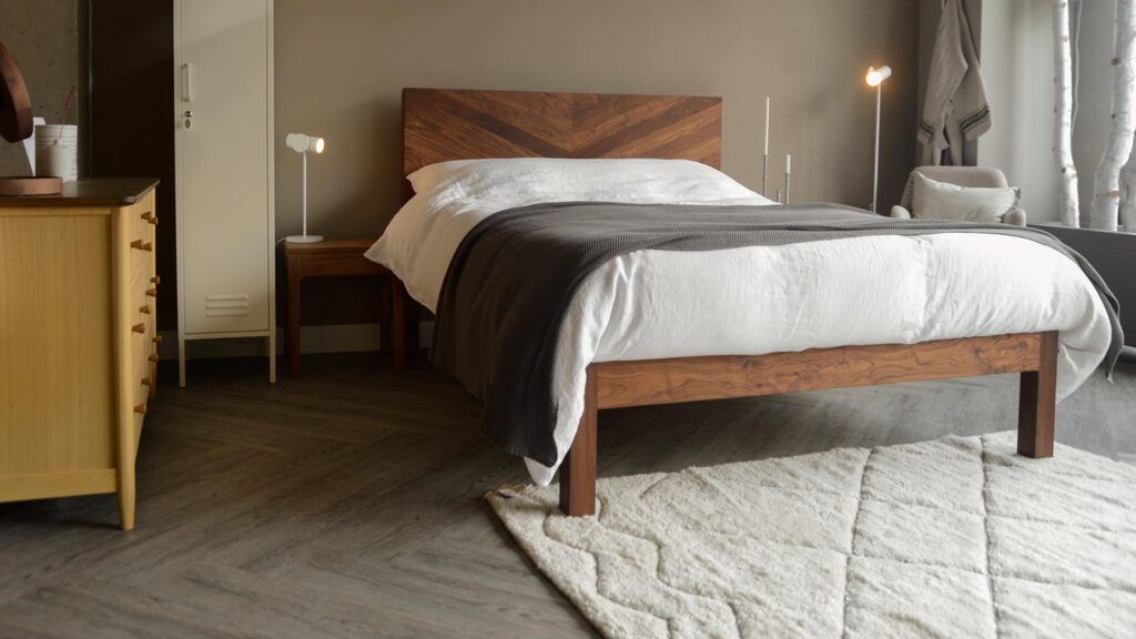 We love walnut because of its deep, rich chocolate tones, striking grain patterns, and luxurious look — it makes any bed or piece of furniture a standout focal point in a bedroom.