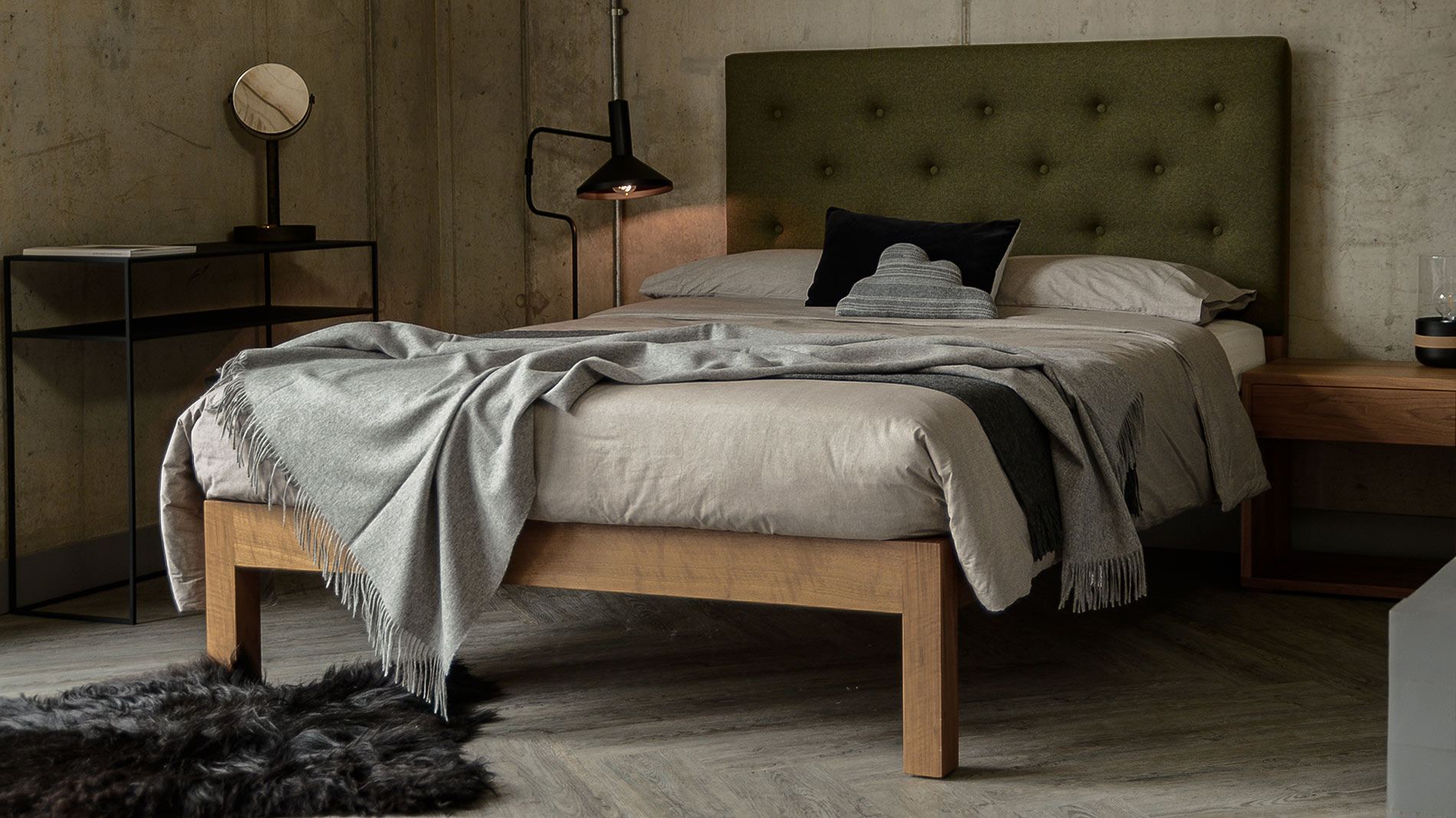 In recent years, as our collection of solid wood beds with upholstered headboards has grown to incorporate a range of designs from the simple, low Iona to the luxury 4 poster Highland, we have noticed how popular Walnut has proven to be when used as a contrast to a fabric headboard. Whether the neutral fabrics in the Tailor and Amatheon ranges or the patterned Parquet pure wool options, the combination of the walnut timber frame and upholstered create a look to suit any bedroom.