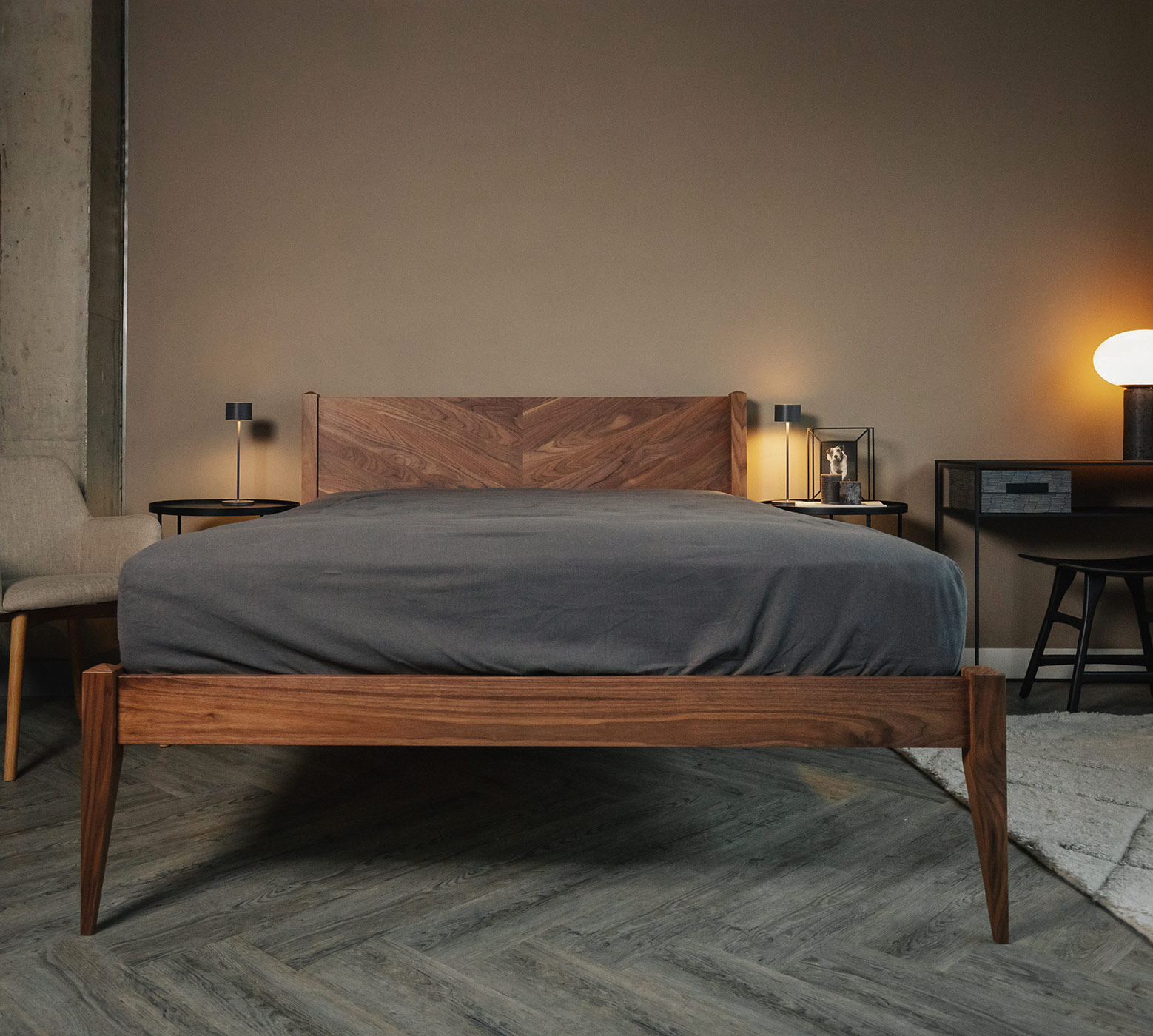 The deep chocolate brown notes of the wood, range from almost black to rich umber and deep gold. This, combined with a whirlpool effect in the grain, makes for a luxurious looking timber – one shown-off perfectly when paired with a base from our Classic Beds collection. The tall, imposing headboards of the Cochin, Zanskar, Samarkand, Orchid and Tibet beds are ideal designs to highlight the opulent qualities of walnut on a large scale.