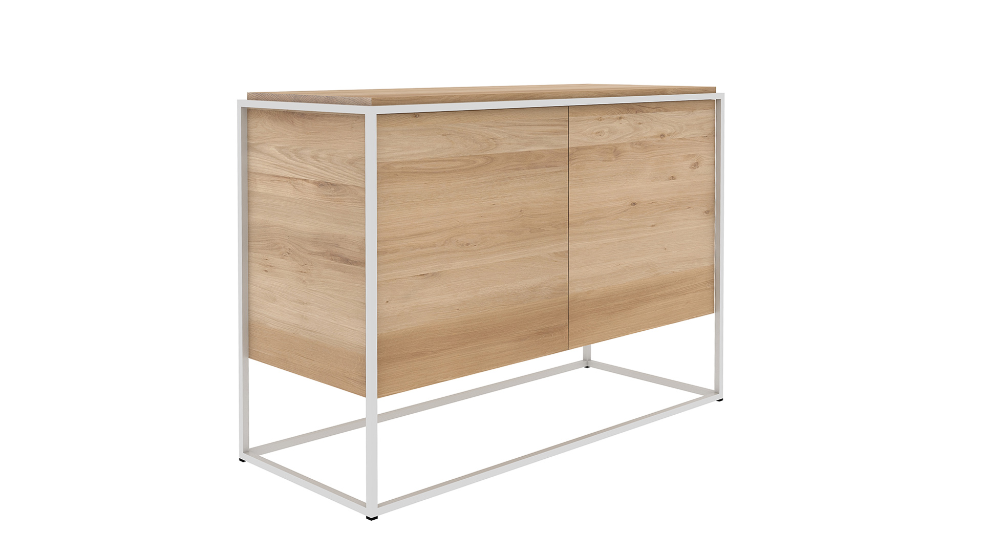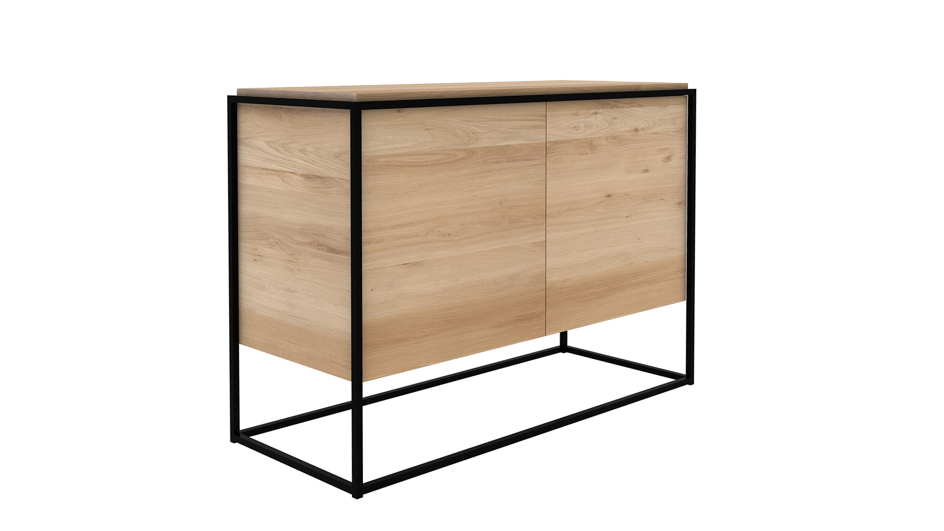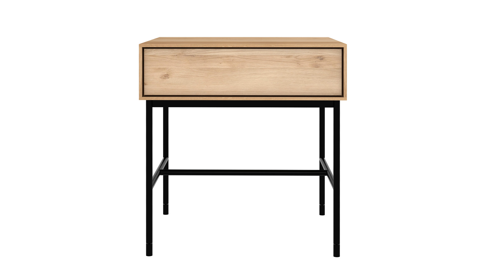 The Whitebird range has the same black metal frame, but the wooden part does not have the back stained outer, instead it is all in natural light oak. The Monolit, Whitebird and Blackbird bedside units are all around 50cm in height. They therefore suit similar beds, you may also want to consider a contrast between the crisp lines of these units and a soft, upholstered headboard – the Arran and Iona would look great with these bedside units.