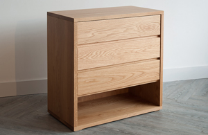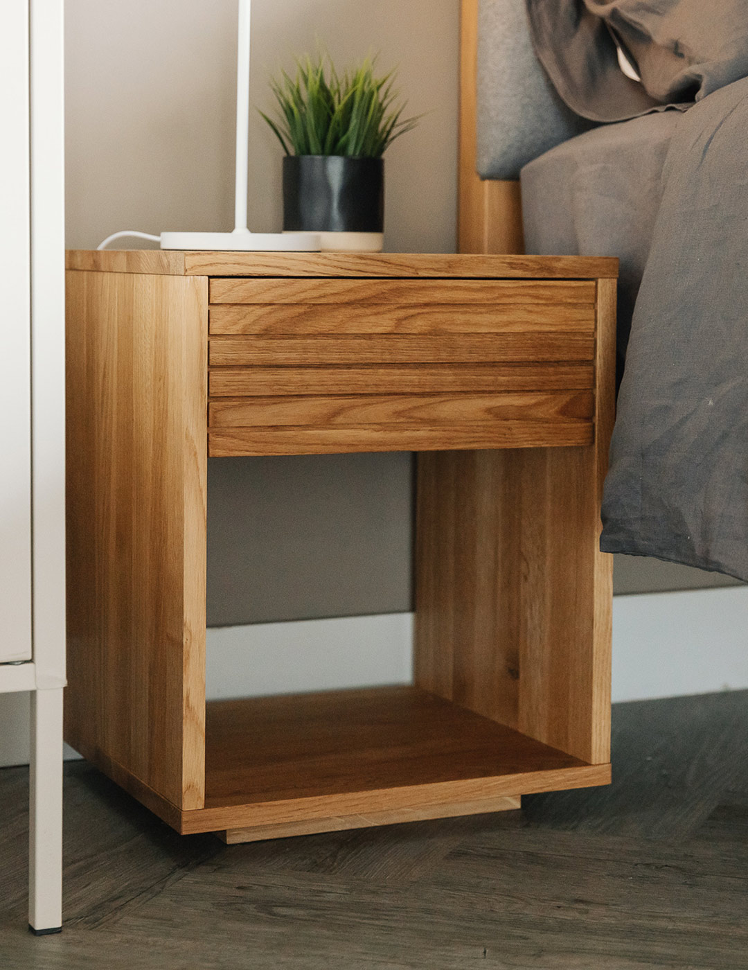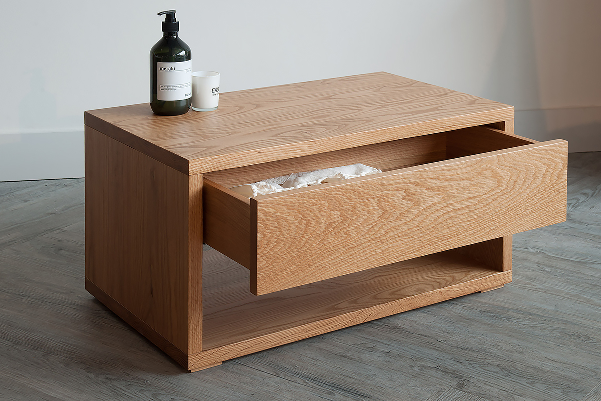 We also offer a wide range of bedsides tables to suit our most popular low oak beds. The Japanese style beds we offer – Kyoto, Kumo, Kobe and Ki – are popular due to their quality and simplicity, so it’s important to find bedside tables that don’t disguise the bed design. The Kyoto table has been specifically designed to work with the Kyoto and Kobe beds – it is available in two versions – the Shelf Table and the Drawer Table. Just select the option that best suits your needs. The low Cube table made at our Sheffield workshops is also a good choice and available in every timber option, including oak.