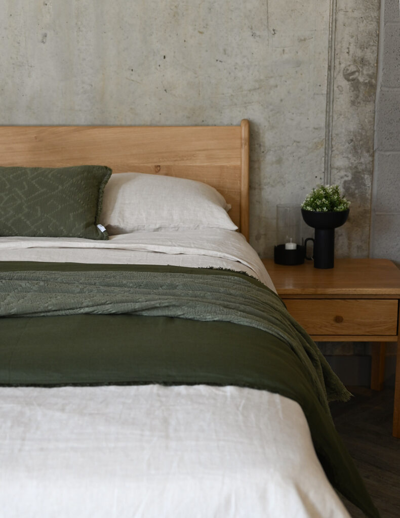 The American White Oak that we use for our oak beds always looks good with neutrals – as can be seen here on our oak Pimlico Bed. The duvet and pillowcases are from our Brown Melange Organic Cotton Bedding Collection. This is a lovely range of soft cotton bedding in a subtle grey/brown shade that works well with both cool grey and warm cream or brown accessories.