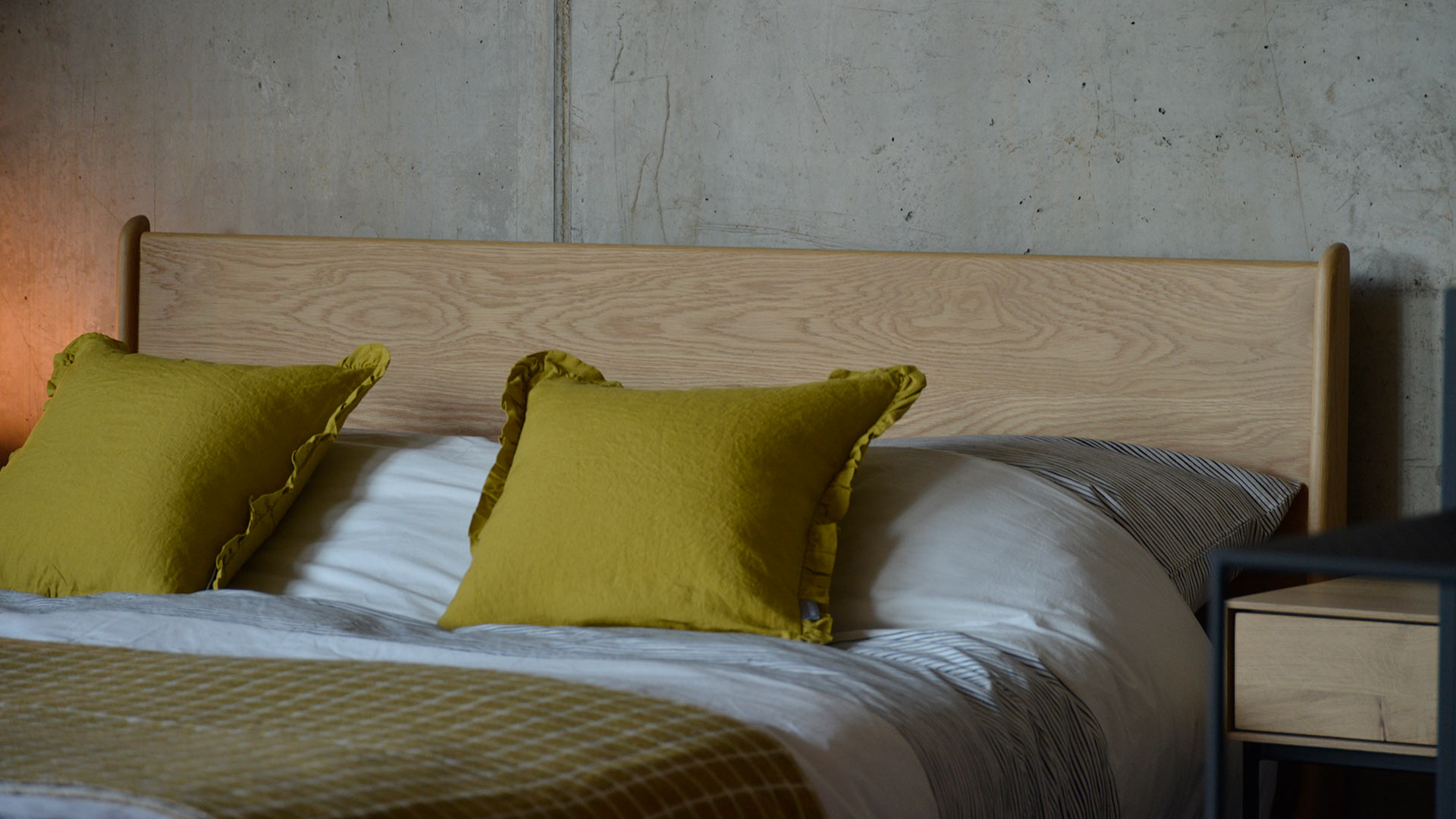 We currently have the bed on display in our showroom with the Ethnicraft Whitebird table, a stylish, modern bedside that mixes a rectangular drawer unit with a black lacquered metal frame. The squared finish of the drawer box contrasts nicely with the curves of the bed and the thin leg sections do not draw the eye away from the beautiful timber of the bed base. The Whitebird table is 50cm tall, so works well with the height of the Carnaby – the bed measures 22cm from the floor to the top of the bed slats. With a mattress 20-25cm in height you would find that the table would be almost level with the mattress. We also show the Carnaby with the Ligna bedside cupboard – Height 50cm x Width 45cm x Depth 40cm – these Ethnicraft nightstands are the last pair available (Ethnicraft has discontinued them), so if you love them as much as we do, order them fast!