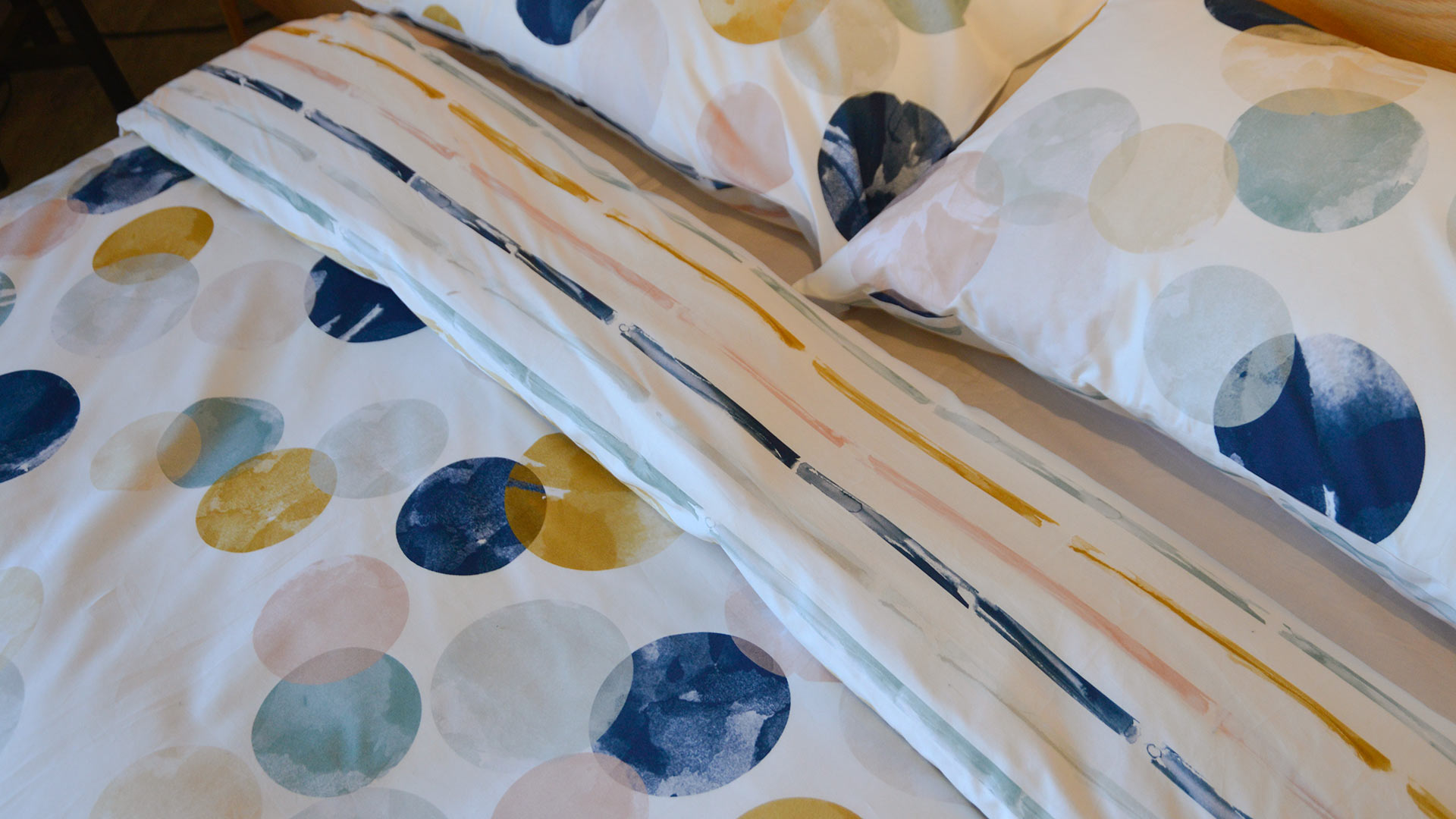 We are currently loving the Modern Reversible Watercolour Pattern Duvet Set – this set has a contemporary reversible pattern with a fresh, bold, painted stripe pattern to one side and over-sized dots on the reverse. The prints appear to be hand painted in watercolours, which adds extra texture and varying hues. We love the combination of subtle, muted colours with simple, modern patterns.