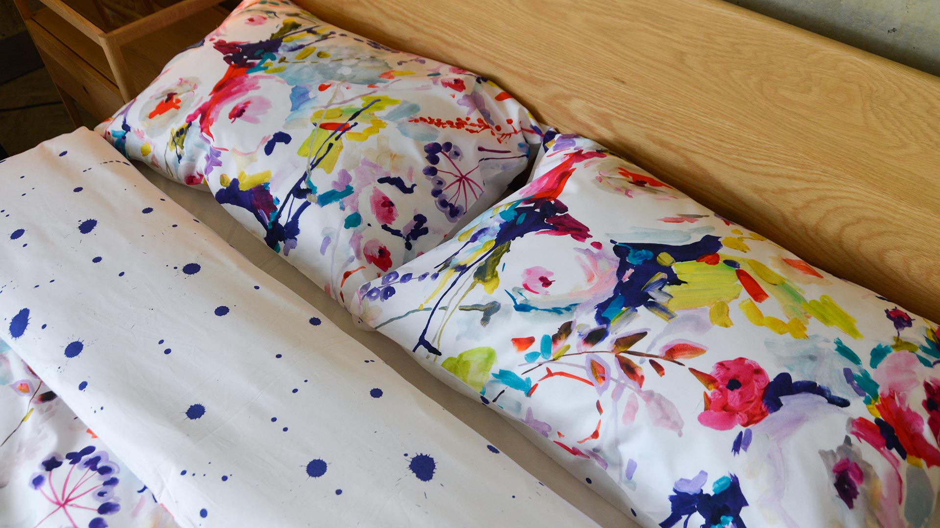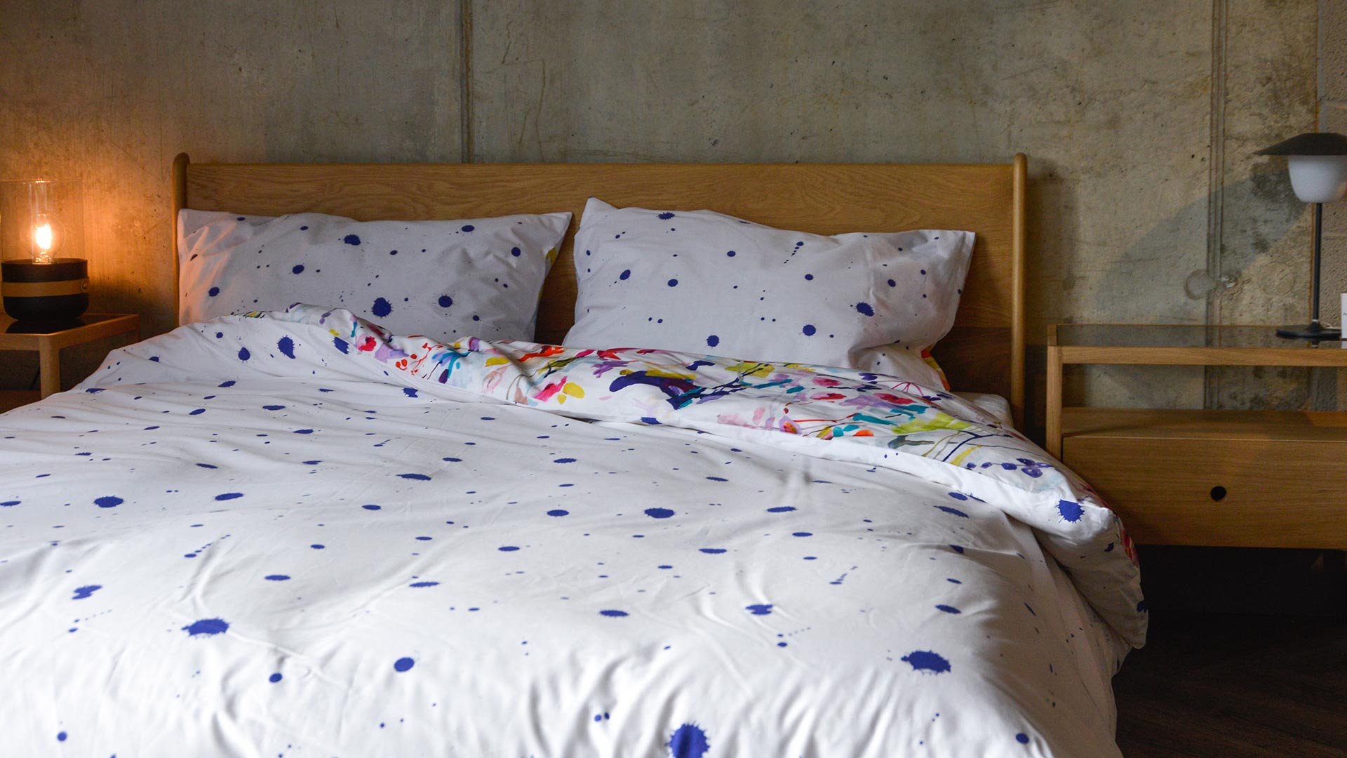If you’re into a brighter and bolder look, check out the Modern Reversible Painted Flowers Duvet set – One side has large, bright, overlapping flowers and leaves in a range of vibrant colours: including indigo, lime, hot pink and aqua – over an ivory background. The reverse has a painted ‘splatter’ pattern in indigo on ivory.