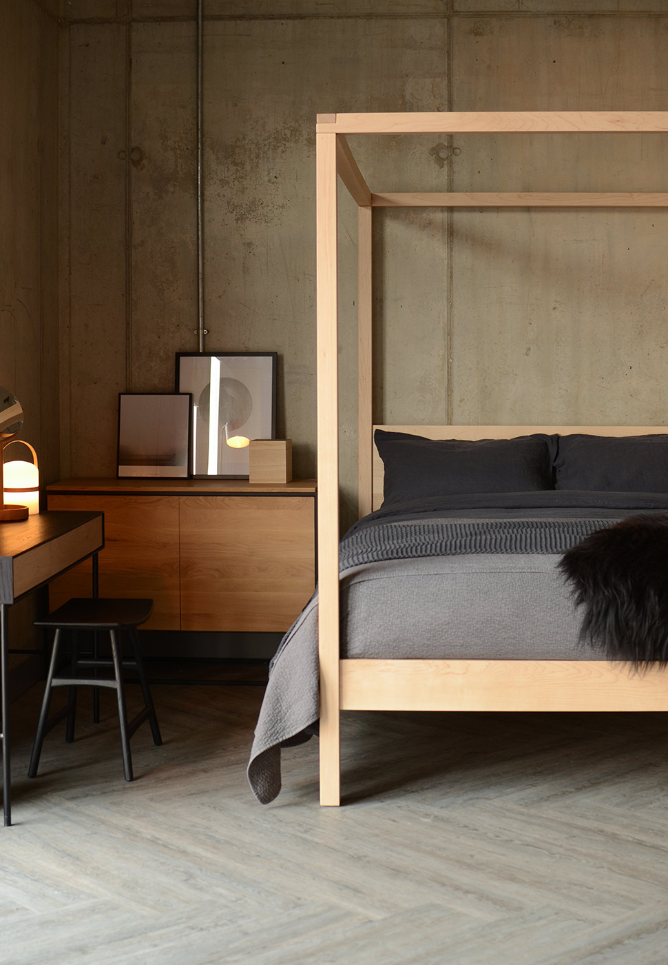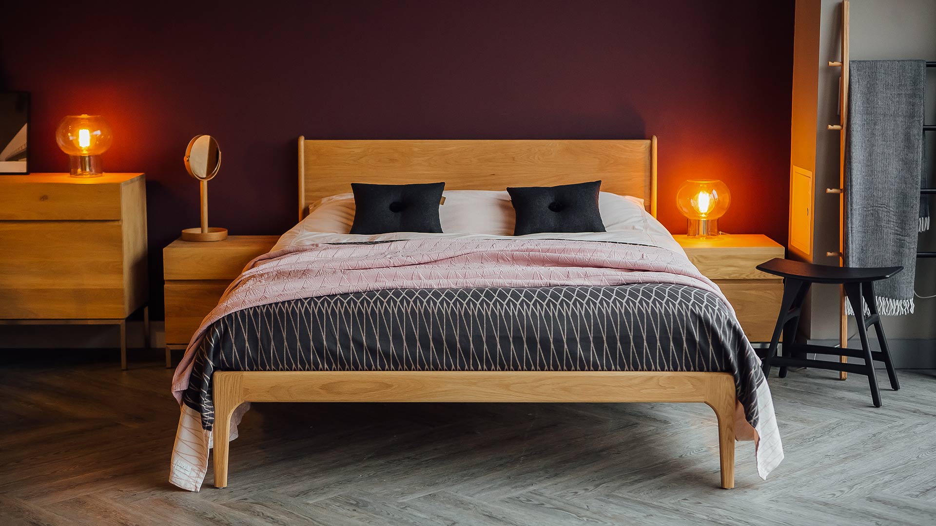Alternatively, any of our timbers with a natural finish would look amazing as a warm contrast to black or white walls and bedding. Natural timber is a good way to soften and add warmth to a stark, modern style. If you like the mix of natural timber with black, you will love the Ethnicraft Monolit and Blackbird collections, a great way to add some touches of warmth to your space whilst still keeping a clean and contemporary style!