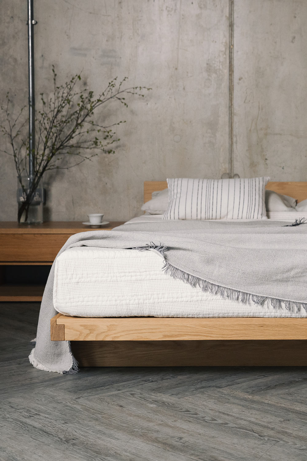 The Kobe bed is the lowest bed in the range, short leg rails ensures the platform appears to hover just above the ground! The height to the top top of the side rails is just 14cm for the Kobe. We’ve chosen to dress the Kobe with very simple, neutral bedding. Take a look at the Melange Organic Cotton Bedding – this neutral bedding will suit any timber and work well with a simple Oriental look.