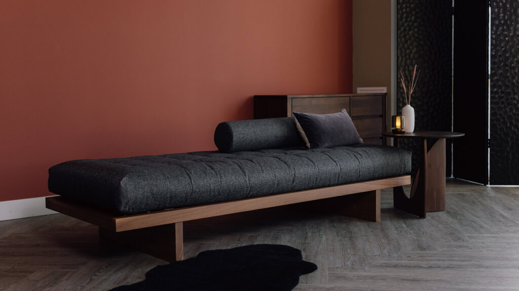 The Kyoto is now also available as a day-bed – it comes complete with a mattress and optional cushion. It is shown above with a walnut base and a dark grey mattress – this combination is perfect for a sophisticated and luxurious oriental look.