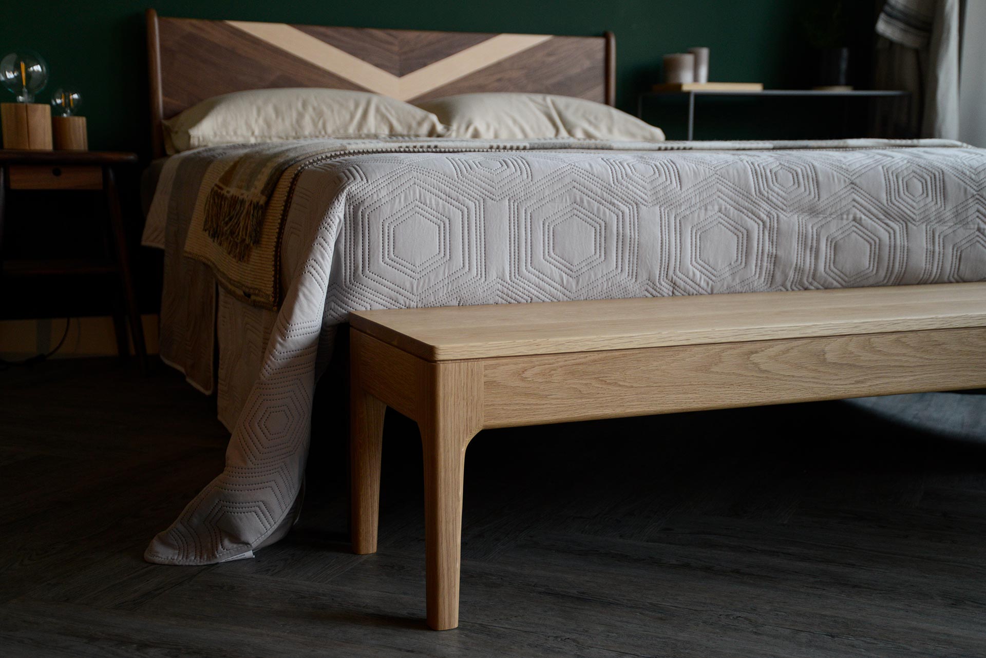 Our wool covered stools are comfy, with a small foot print and a flat surface – so they answer all of these requirements perfectly! Available covered in a lovely wool melange fabric in a range of neutral shades – they make an easy addition to any bedroom. We would recommend the wool covered stool in black with the Blackbird desk – a stunning, contemporary dressing table/desk in oak with a black stain to the frame, natural oak drawer and black metal base. This modern table and stool will work well with any of our modern bed designs – if you have the room I would suggest an Orchid bed in natural oak or black stained oak.