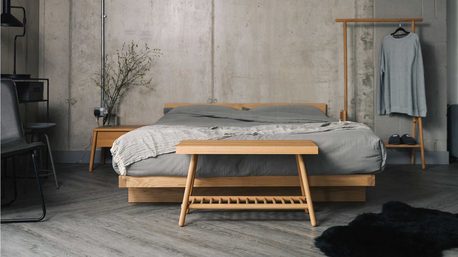 The Osso stool is a particularly popular choice for minimalist, Japanese style bedrooms. The Osso is available in solid oak, black stained oak or solid walnut – it has a gently curved seat and turned legs. We have used the Osso with a range of dressing tables – my favourite is the modern, oak Wave table – and we often show it with the Japanese look Kyoto bed.