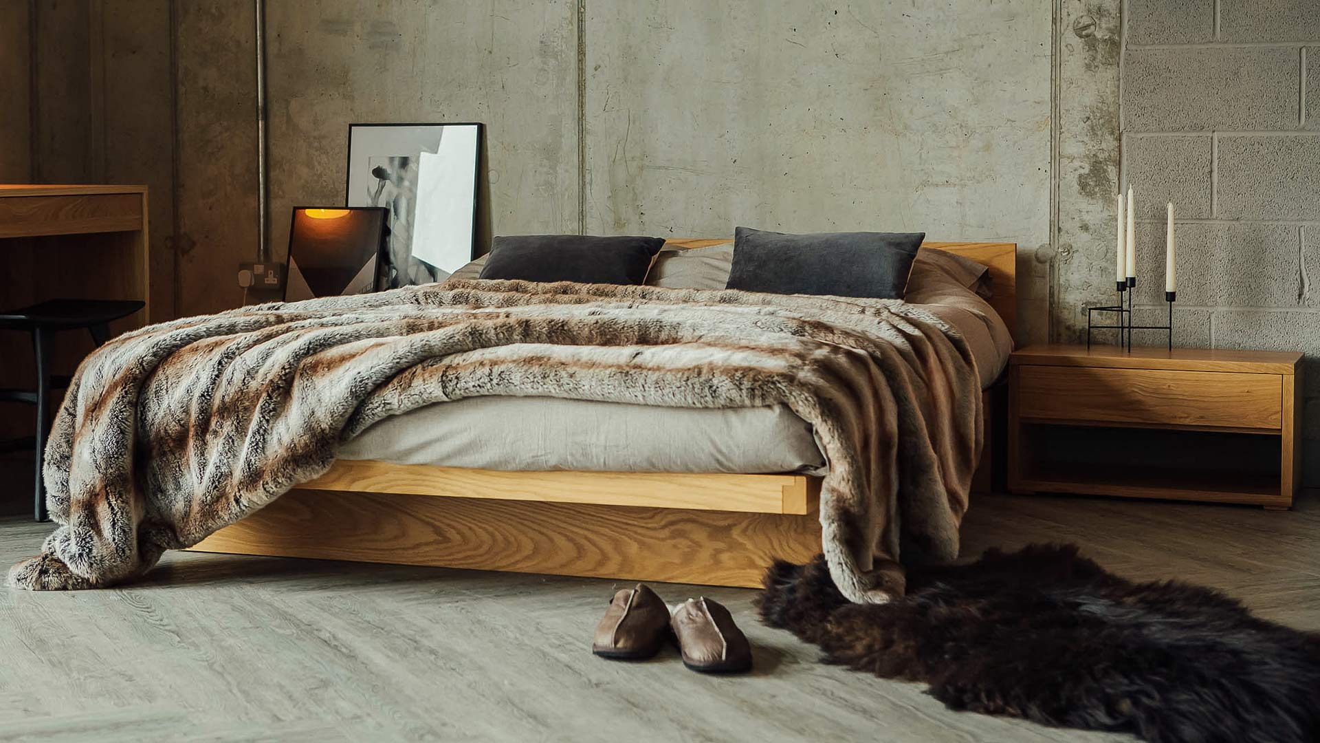 The Warm Nordic look will suit most of our contemporary bed designs – but in cherry, oak and walnut they will make for a richer colour choice than last years cool maple and ash beds. The Highland bed, a modern four poster, in solid cherry wood with an upholstered headboard in an ecru shade is a great example of this colour palette.If you are looking for bedding in cream, stone and caramel shades – then do have a look at our natural bedding range. I particularly love the pure organic cotton bedding range in brown melange. This bedding range will work well with a wide range of warm accent colours and accessories, such as the luxurious faux fur bedspread in rich ‘Brown Bear’ or soft ‘Cement Grey’. If you are looking for a bolder choice then try our chartreuse linen bedding – it looks great with silver grey and charcoal accessories.