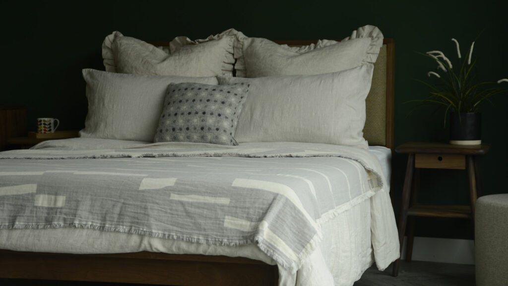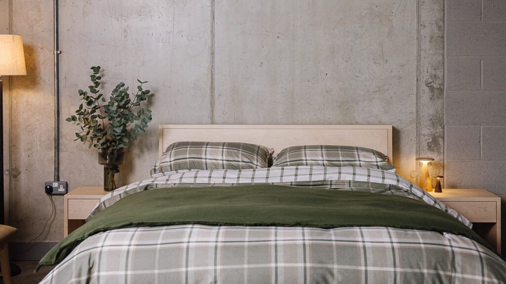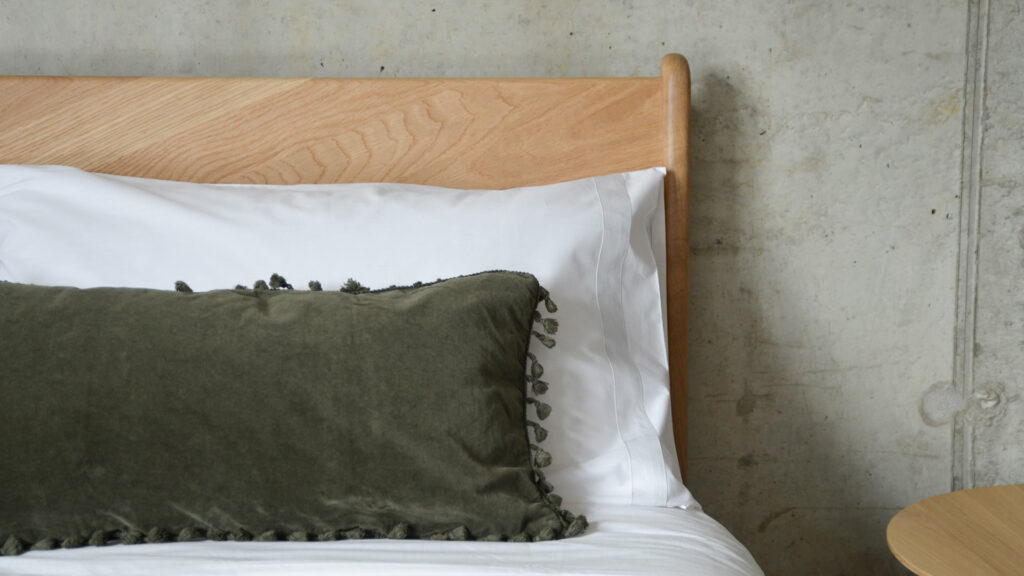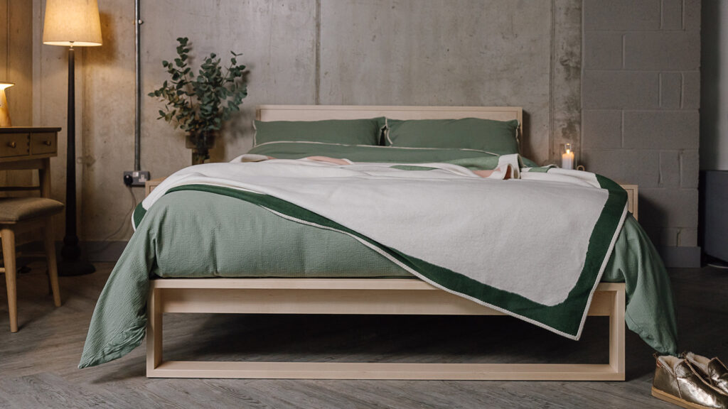 With the focus of this blog being going green, what better place to start than with our range of bedding in pure organic cotton? Supplied by a company is based in Devon, UK, the organic cotton used in their products from agricultural projects across Central Asia. Organic cotton is a great investment as it is durable and long-lasting, and also comfortable and naturally breathable, making for a lovely choice for your bedding.Some of our favourite staples are their Ivory Bedding sets and Brown Melange bedding sets – these make for perfect bases for your green throws to sit atop and are easy to pair with light or heavy throws all year round. You can see the brown melange organic cotton bedding in our main image above. It looks wonderful on our Skye walnut bed with a tall headboard upholstered in our new Poole fabric in Cyprus Green.