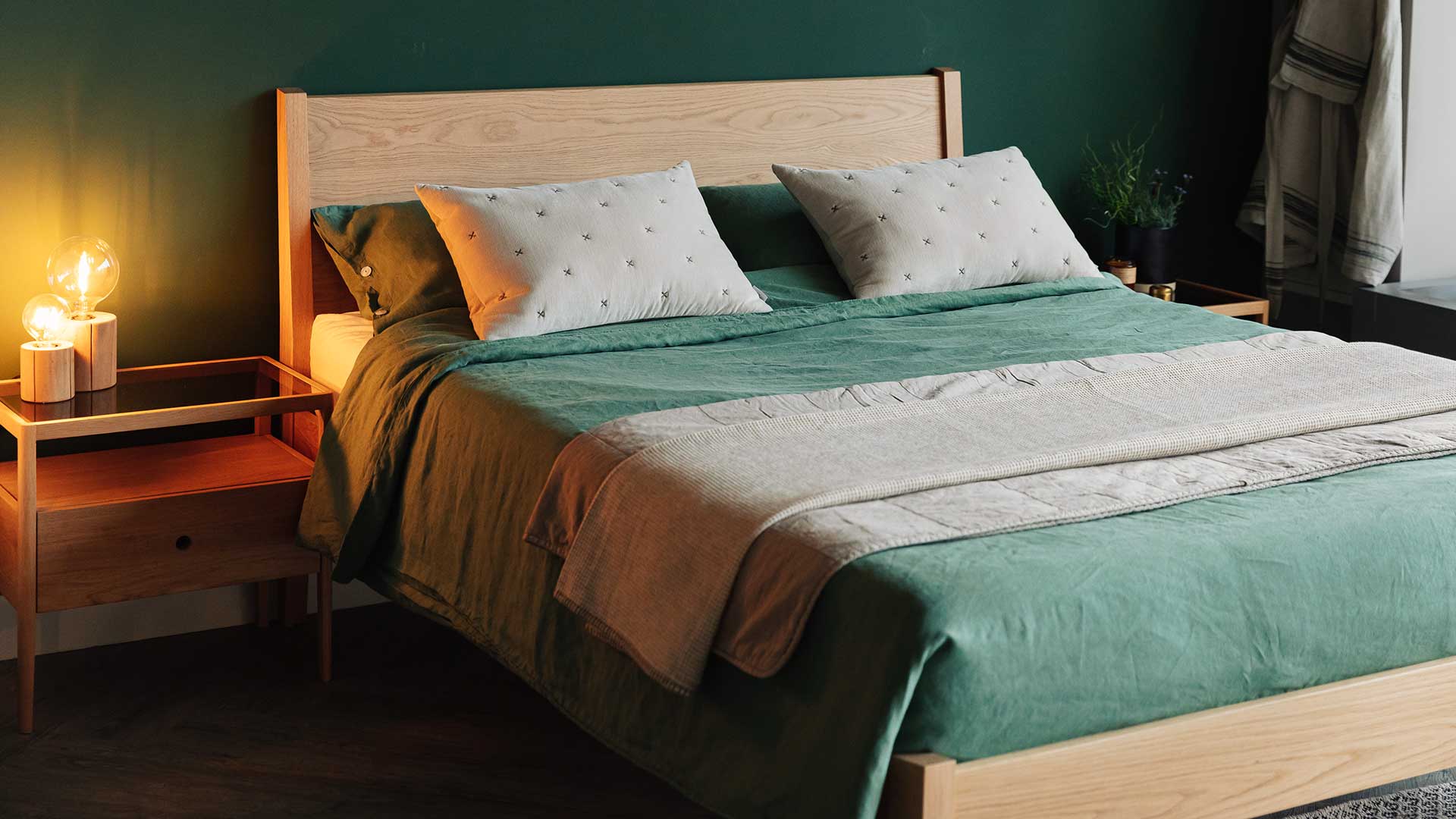 We have a whole blog post dedicated to our full range of green bedding, but some of our top picks are the Herringbone Cotton Blankets in Olive, and the Organic Linen Bedding in Sage Green. (The latter is a particular staff favourite!)