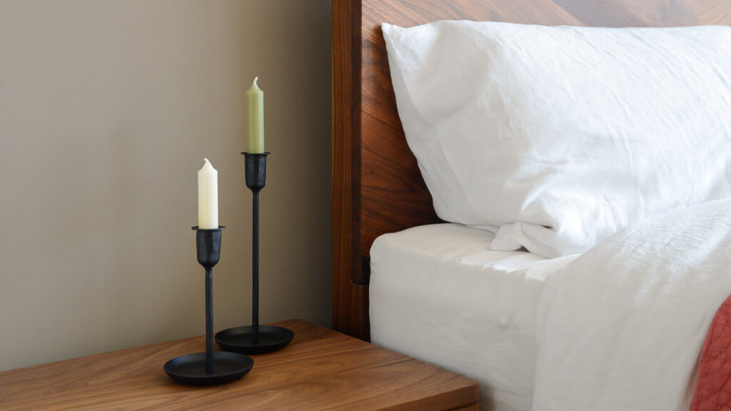 The accessories pictured also feature our new Wall-mounted Candleholder in black coated metal. For matching accessories, also see the matching Set of 2 Rustic Candleholders. The silver candlesticks pictured on the bedside table and black candle holders can all be found in our candle-holders collection.