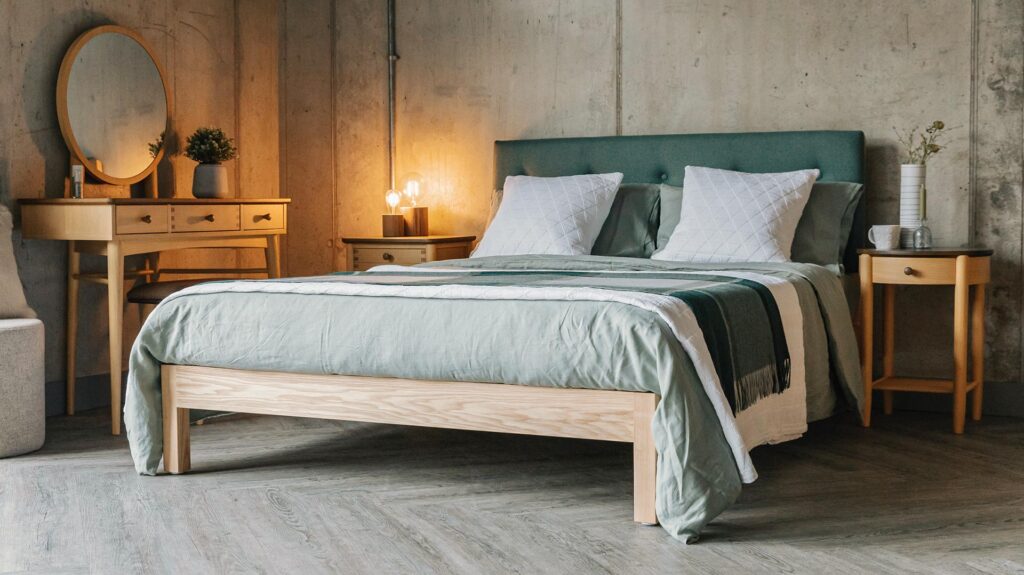 Below, we’ve styled our Arran bed base with monochrome in mind. Our chosen tone was greens; sage green bedding with matching lowdown locker, a headboard upholstered in Amatheon Seaglass fabric and countless throws in complimentary green tones! See our other bedroom inspiration post; Greens, Blue & The Arran Bed Base, for a full breakdown on how we achieved this look.
