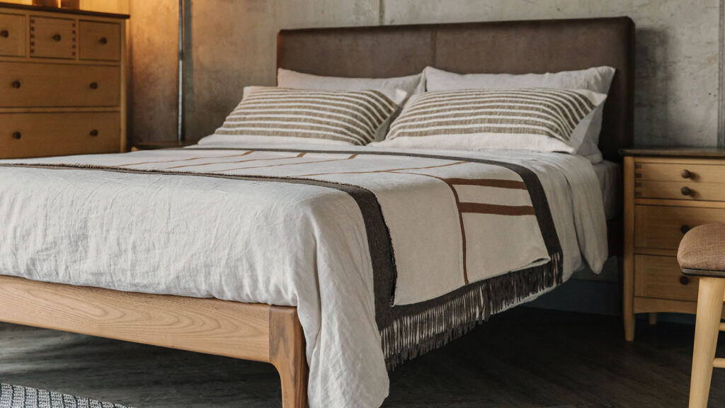 Below, we’ve styled our Bloomsbury bed base in a heap of natural neutrals. The newest addition to our Bloomsbury range, this bed base boasts a faux leather headboard in the colour Saddle. To match the look of this bed, we’ve styled it with our Two Tone furniture range. For the bedding, we’ve used our Organic Linen bedding in the colour Stone, then topped with a Luxury Recycled Wool throw in the colour Bitter Chocolate. Then, we’ve accented a Reversible Abstract throw in brown over the top, and finished off with a pair of oblong cushions with Brown Stripe Cushion covers. Our Two Tone range of bedroom furniture is available in a wide range of sizes and styles to suit your space. They’re also great for pairing with neutral colour schemes as they bring both light a dark accents. You can find the full collection here on our website.