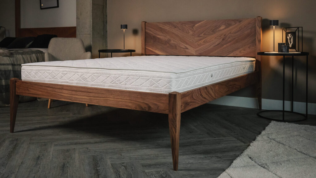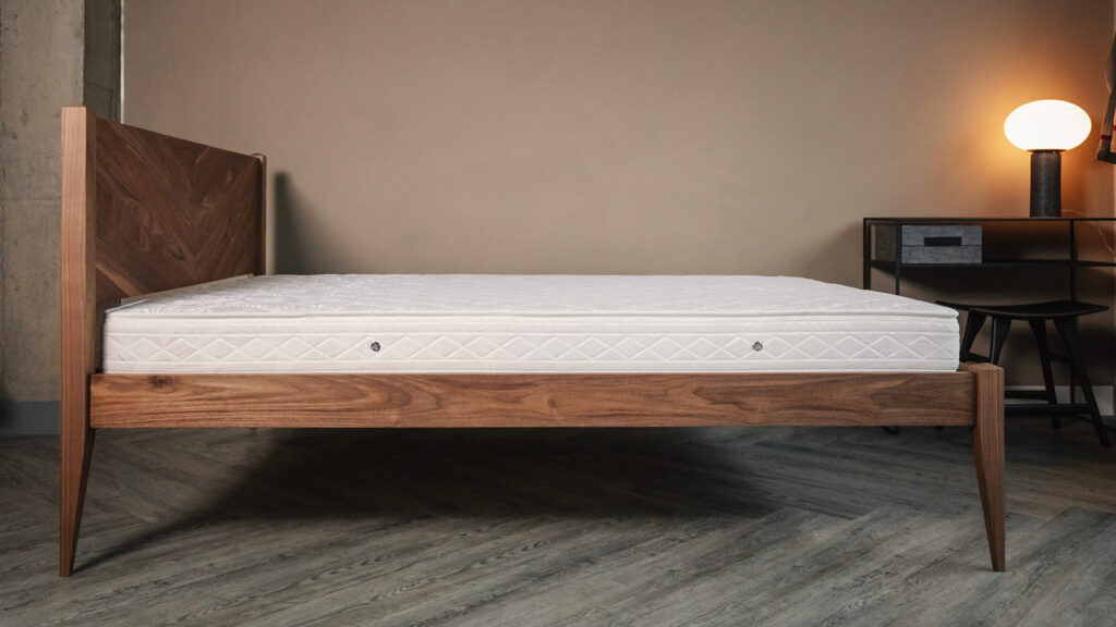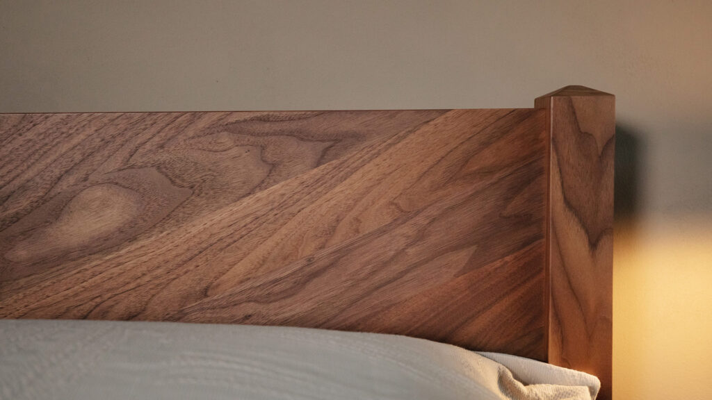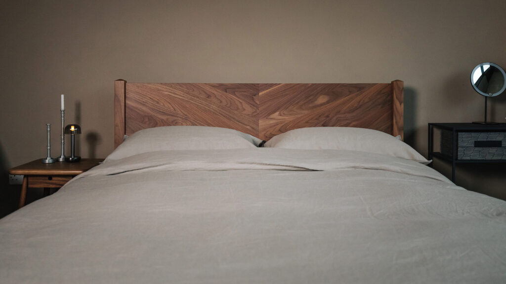 Initially inspired by the Hoxton Contemporary Bed Base, the Dalston features our ever popular chevron pattern. This expertly craft pattern not only adds a beautiful modern twist on a classic bed design, it also highlights the natural variation within the beautiful timbers we use. We have chosen Walnut for our first display bed to emphasise the mid-century look. You can find out about all our timbers here.