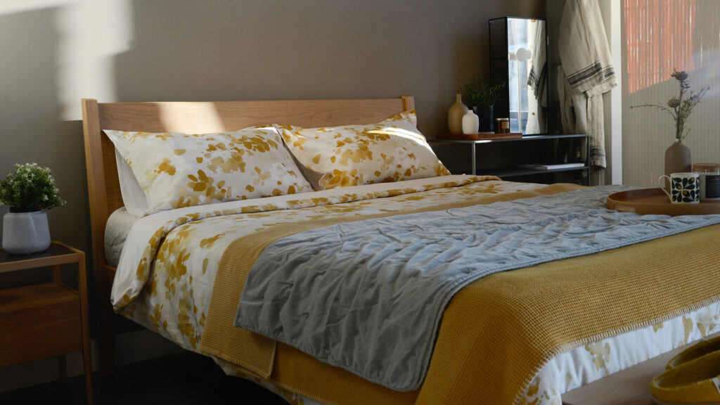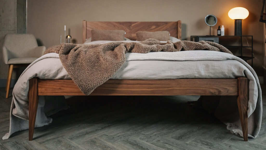 The Hoxton has been one of our most popular designs since its introduction. You’ll often find it pictured in walnut, our darkest timber; true to mid-century ideals. Walnut is one of the most popular timbers for this bed because of its varied grain pattern and spectrum of darker tones. Walnut can feature some blonde sections, which are perfect for drawing attention to the chevron pattern. Cherry and ash are also popular timbers for this bed, again due to the variations and patterns in their grain.