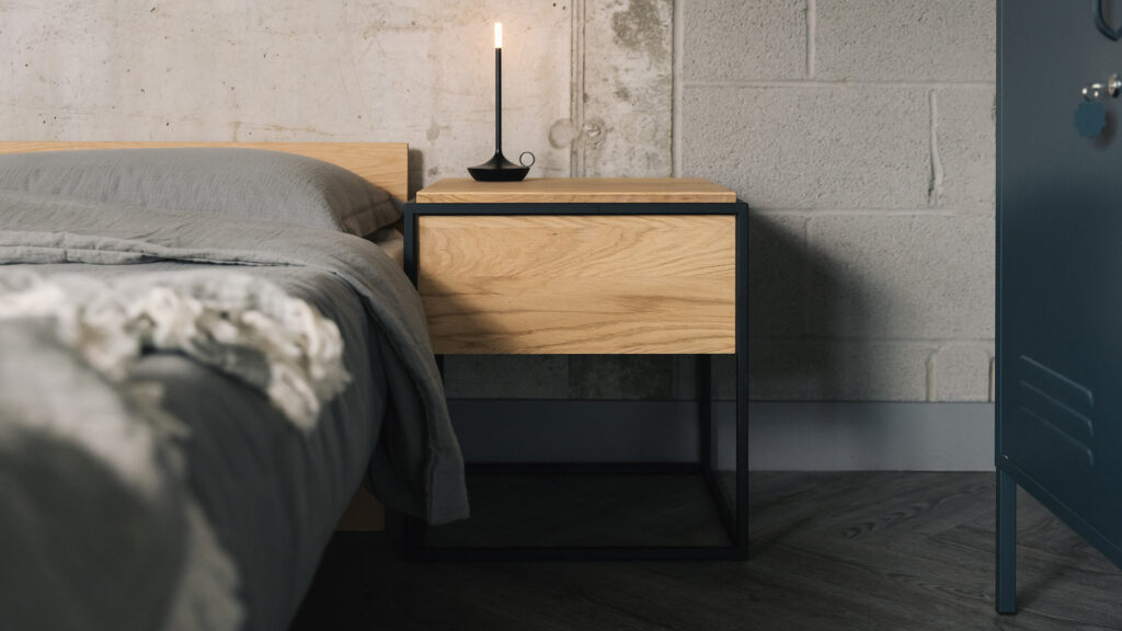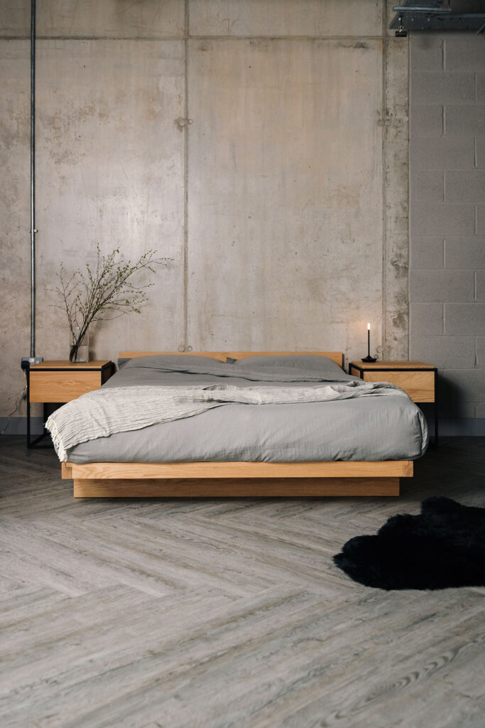 We’ve incorporated the Monolit bedside tables in natural oak, with a black metal frame. These bedside units are stylish yet minimalist, with useful drawers for storage. These bedside units look great with the Kumo low Japanese bed. The graphic, rectilinear design of the Kumo bed ensures it suits a wide range of styles, but the metal furniture used here gives this look an urban edge.