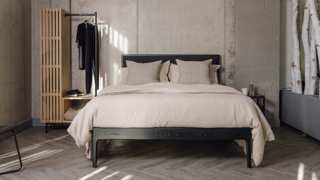 We’ve styled this combination with clean, minimal ideals in mind. This look is all about contrast and complement. Adding details such as soft geometric lines – found on both the Modern Oak Open Wardrobe to the left and the Linen Windowpane Cushions on the bed – adds a gentle contrast to the curves on the bed. The dark timber and fabric of the bed is contrasted with the pale Organic Muslin Bedding in the colour oatmeal. It is deliberately not white, but a soft beige. This complements the black finish of the bed rather than creating too stark of a contrast.