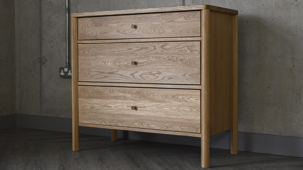 Again this unit is in oak with an oiled finish. The top and frame have curved corners, each drawer has an oak pull and runs on a wooden friction based runner. Though the oiled finish differs from the lacquer we use for our beds we feel it tones well with our American white oak and English oak beds. (Photographed above with our Camden bed in English Oak)