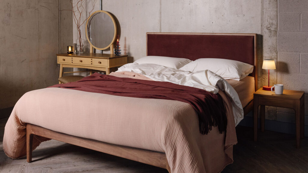Any of our upholstered beds look great with a red headboard – we love the depth of the “Rum Raisin” velvet fabric used with the rich Walnut Carlisle bed base below. The Smoked Walnut Malabar also looks incredible against an earthy red backdrop, adding to the warm and cosy feel – perfect for a bedroom scheme!