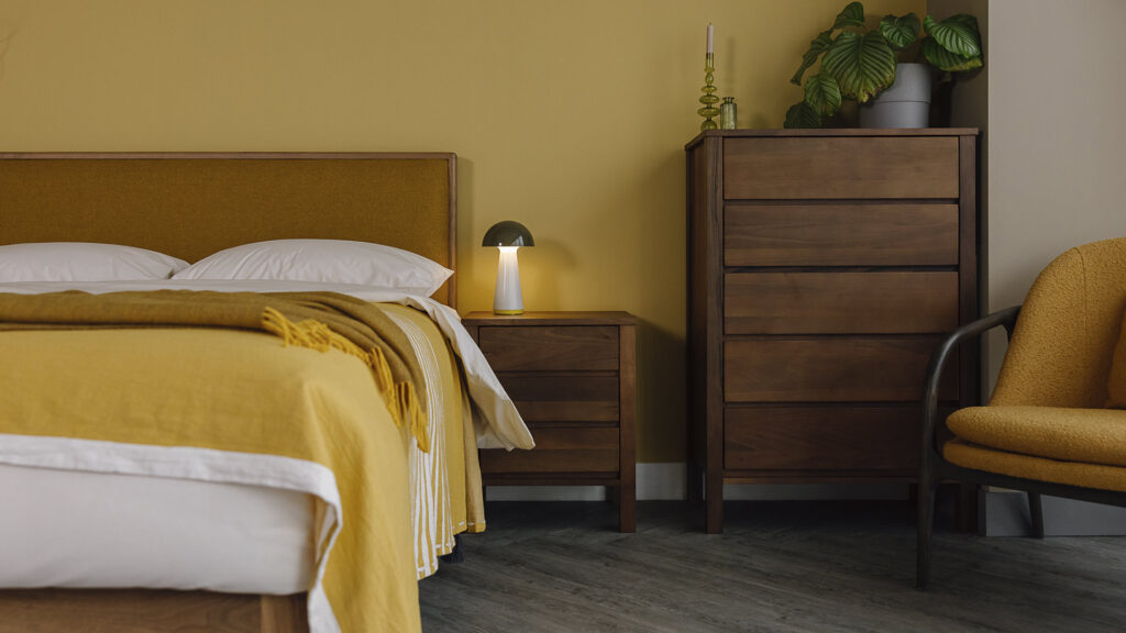 The Ash Oregon below compliments the soft yellow wall whilst still keeping a modern Japandi look. The Walnut Carlisle however gives a more mid-century style, the chocolate brown walnut contrasting and complimenting the soft yellow shade. The Carlisle is finished with Parquet Gold for another tonal layer, building up visual interest without introducing too many competing colours. Keeping your bedroom bright but calming rather than busy.