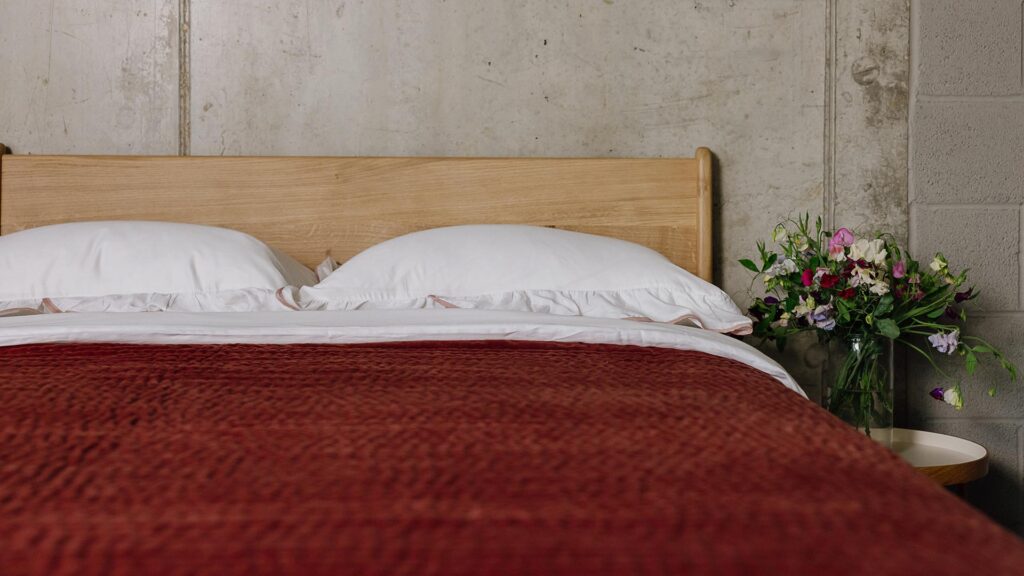 Most timbers work well with shades of blue. The Maple Leith paired with Gingham Navy bedding provides a light and fresh feel, whereas the Oak Pimlico balances the cool of the blue Gingham bedding with warm for a harmonious and balanced look. The rich Walnut of the Harrow four poster bed paired with muted blue stonewash bedding provides a more sophisticated feel.
