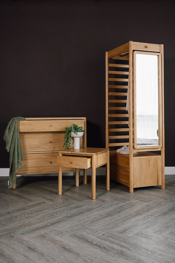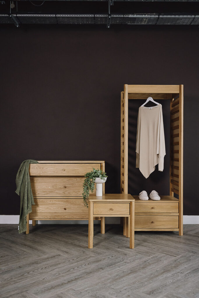 We craft a range of bedside tables ourselves in American white oak and we make the Camden drawer table in English oak. However we have lots of other options, made by other makers, available too. From bedside tables and nightstands to open wardrobe units and chests of drawers – you’re sure to find a design to suit your needs.