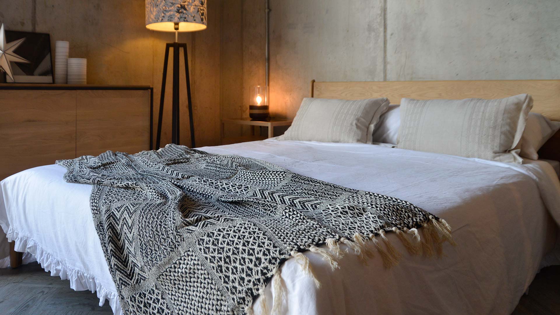 A luxury boho bedroom may incorporate an embroidered duvet cover or rumpled linen bedding. Add a quilted bedspread and a textured wool throw. If you are going for a subtle take on the style, mix a washed linen duvet set in white or dove grey with a textured bedspread and fringed throw.
