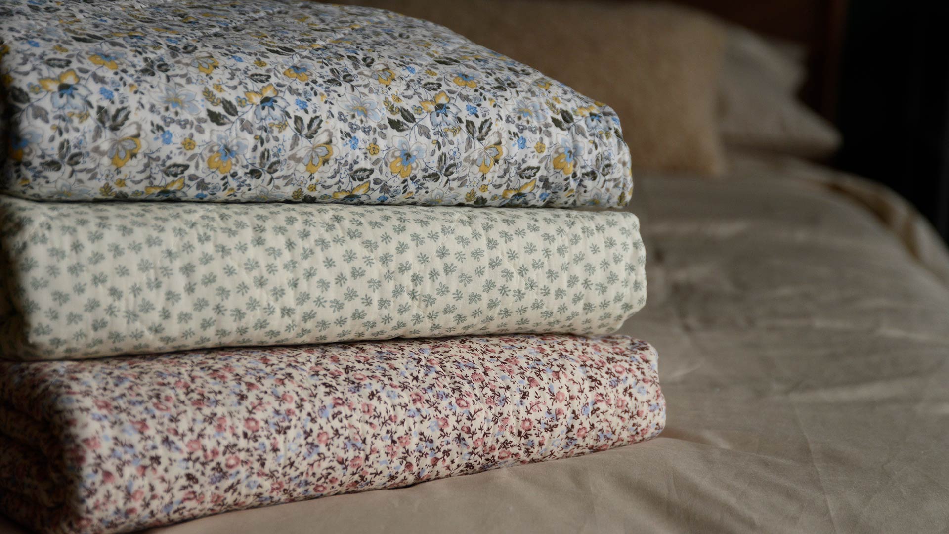Our pretty embroidered quilts – blue kantha and blue fleur are perfect for a cool, dreamy look. Pile on a variety of cushions – they don’t need to match – for a cosy feel. For a bright and bold look, check out the Velvet Reversible Quilt in Tumeric Yellow, it gives a cosy feel whilst still providing a pop of vibrant colour.