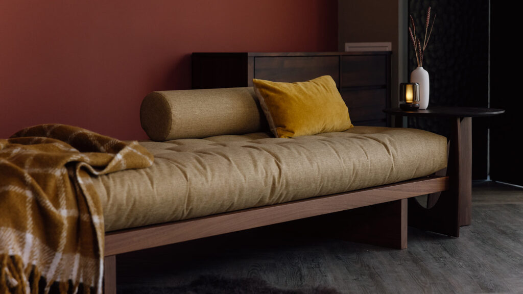 The Kyoto day bed is a luxurious addition to your lounge or bedroom. This incredibly comfortable day-bed can be used to relax on, or as additional seating or a useful extra single bed. The Kyoto day bed included our beech sprung slats for guaranteed comfort while sleeping. The hardwood base is available in our full range of hardwood timbers – beech, ash, oak, maple, cherry or walnut. The sprung mattress is made in Denmark, upholstered in a range of stylish fabrics, offering extra comfort and support.