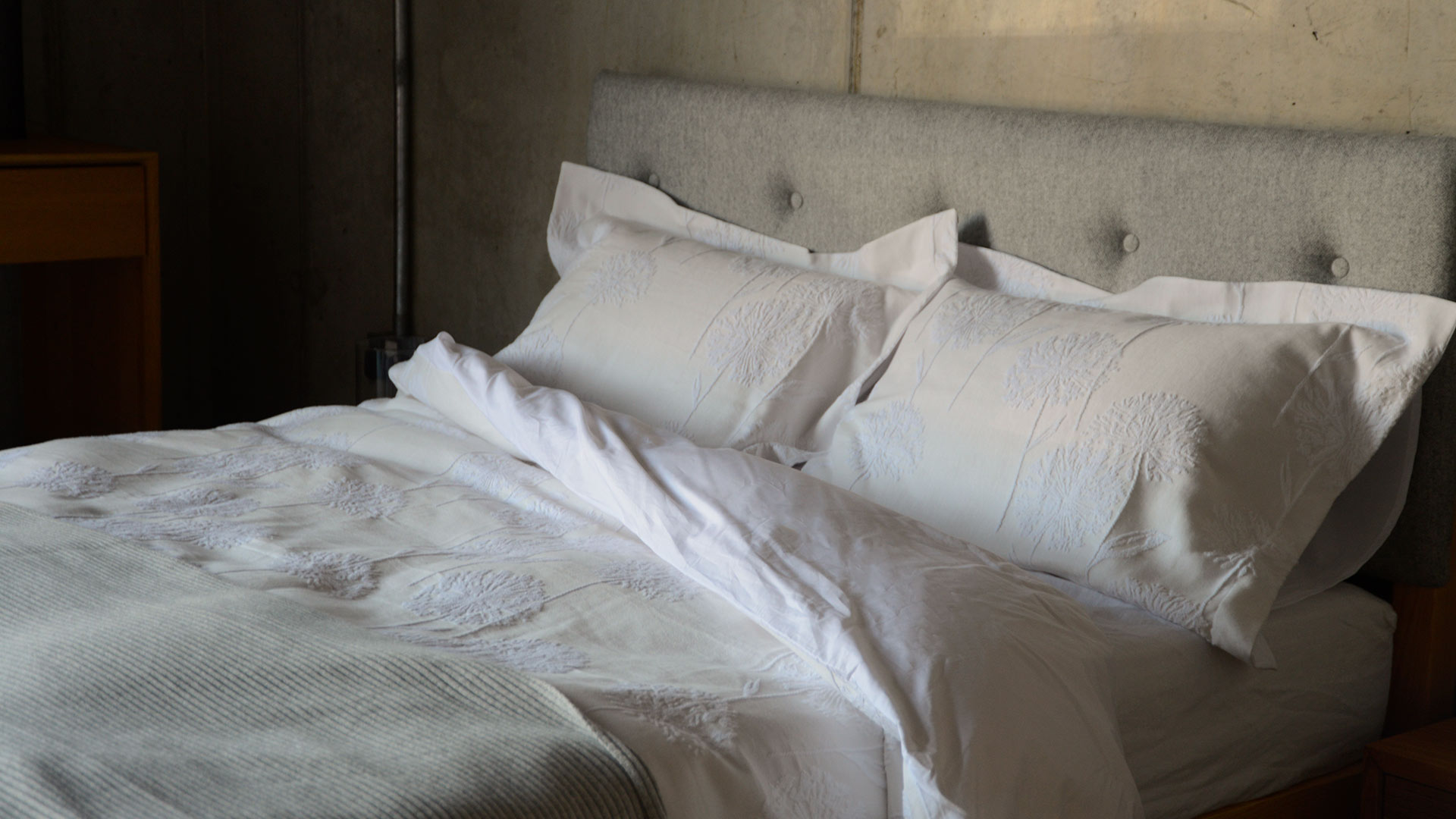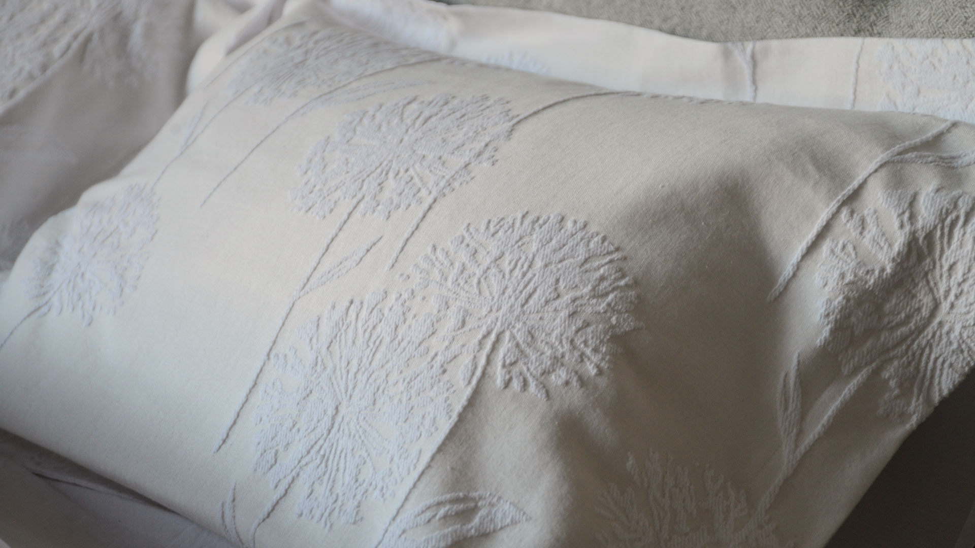 The duvet and pillowcase front are in a textured fabric, while the reverse is in a soft plain cotton. A two-in-one solution: soft as classic cotton bedding, but with the texture and pattern of a bedspread.