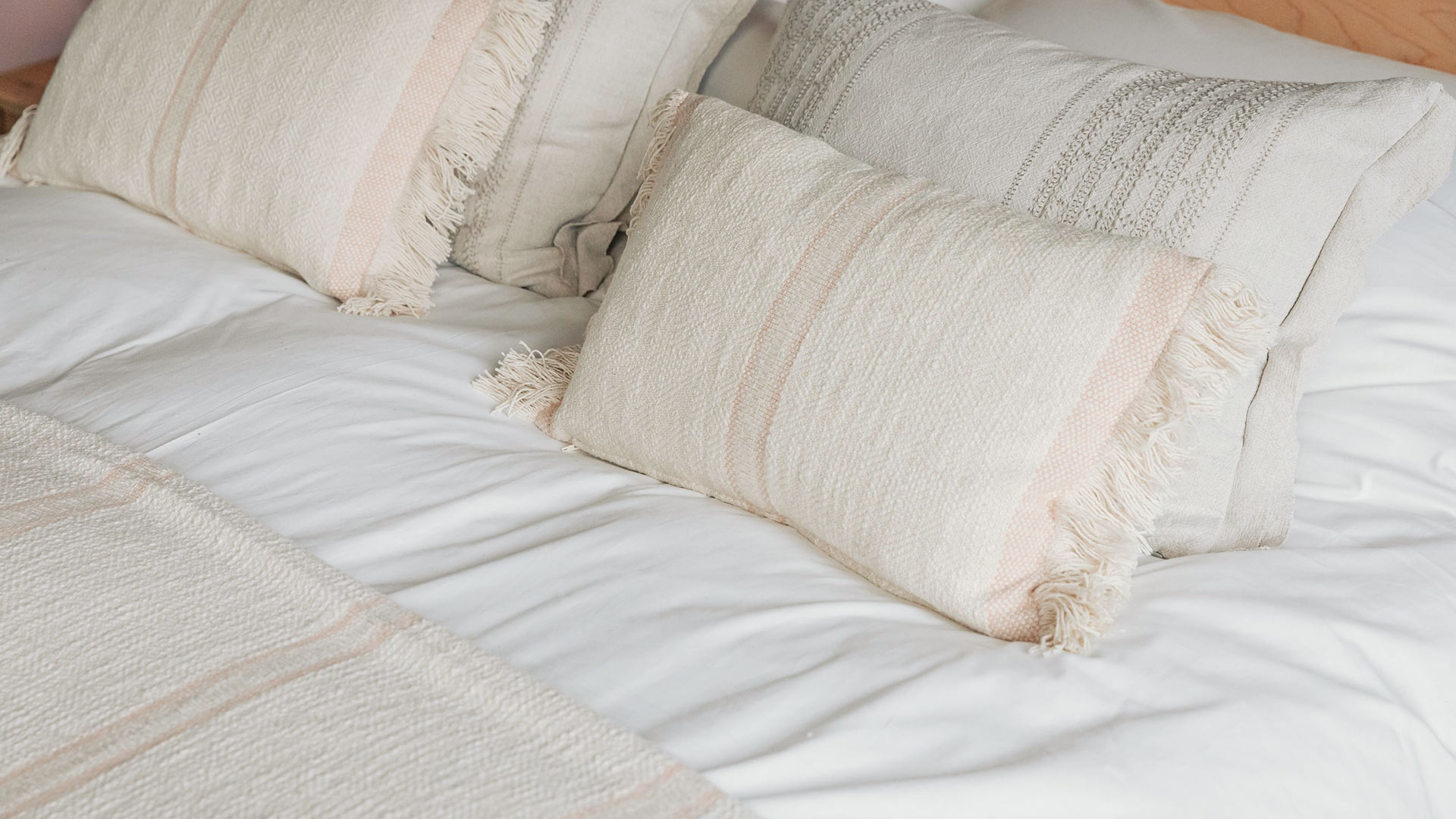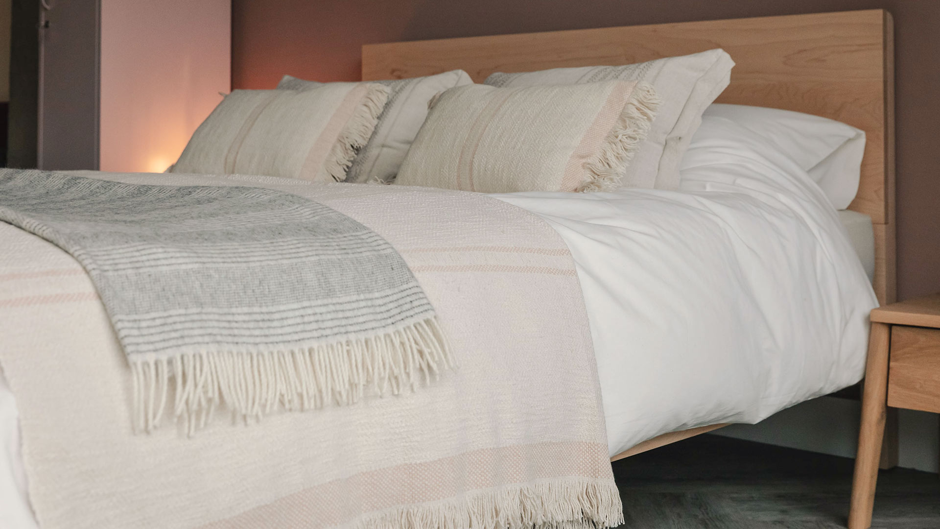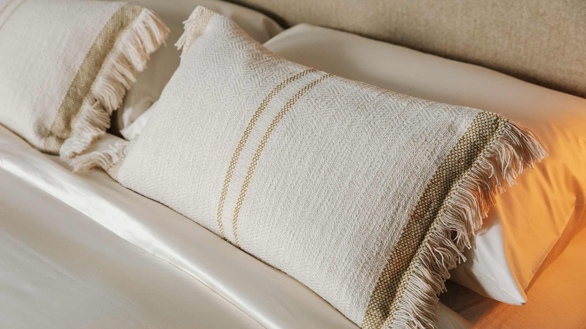The Andas is a large, soft cotton blanket in ivory with stripes of varying depth. The Andas has a fringed edge to two sides and is made of 100% cotton – incredibly soft to the touch. Available in two new colours: blush pink or warm olive. Matching Andas cushions are also available.