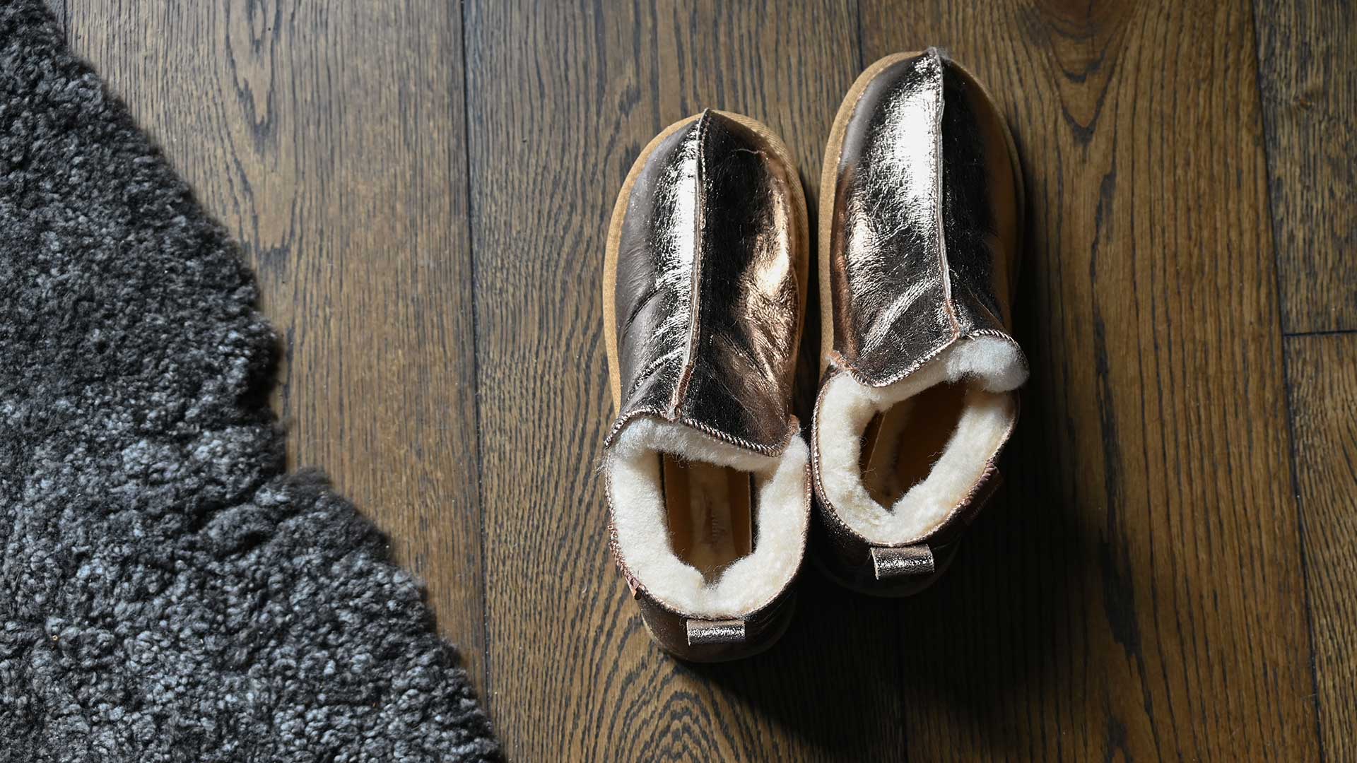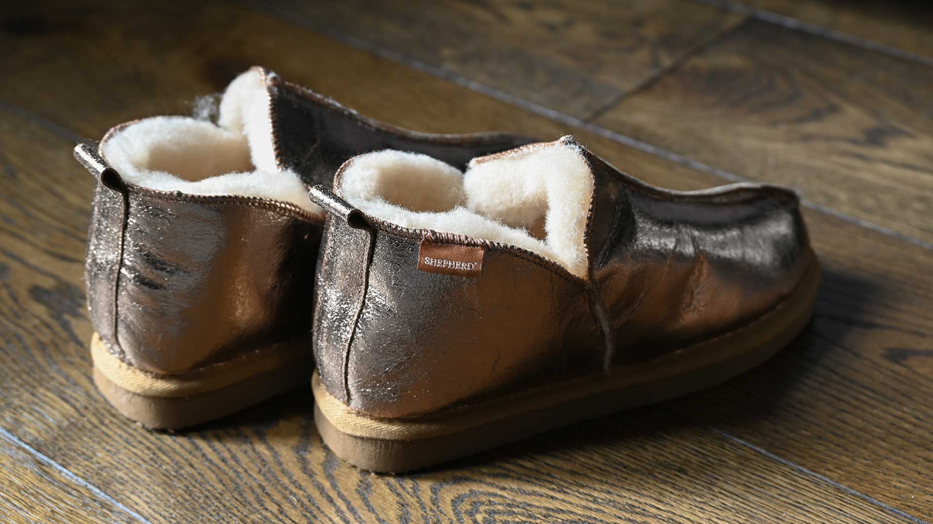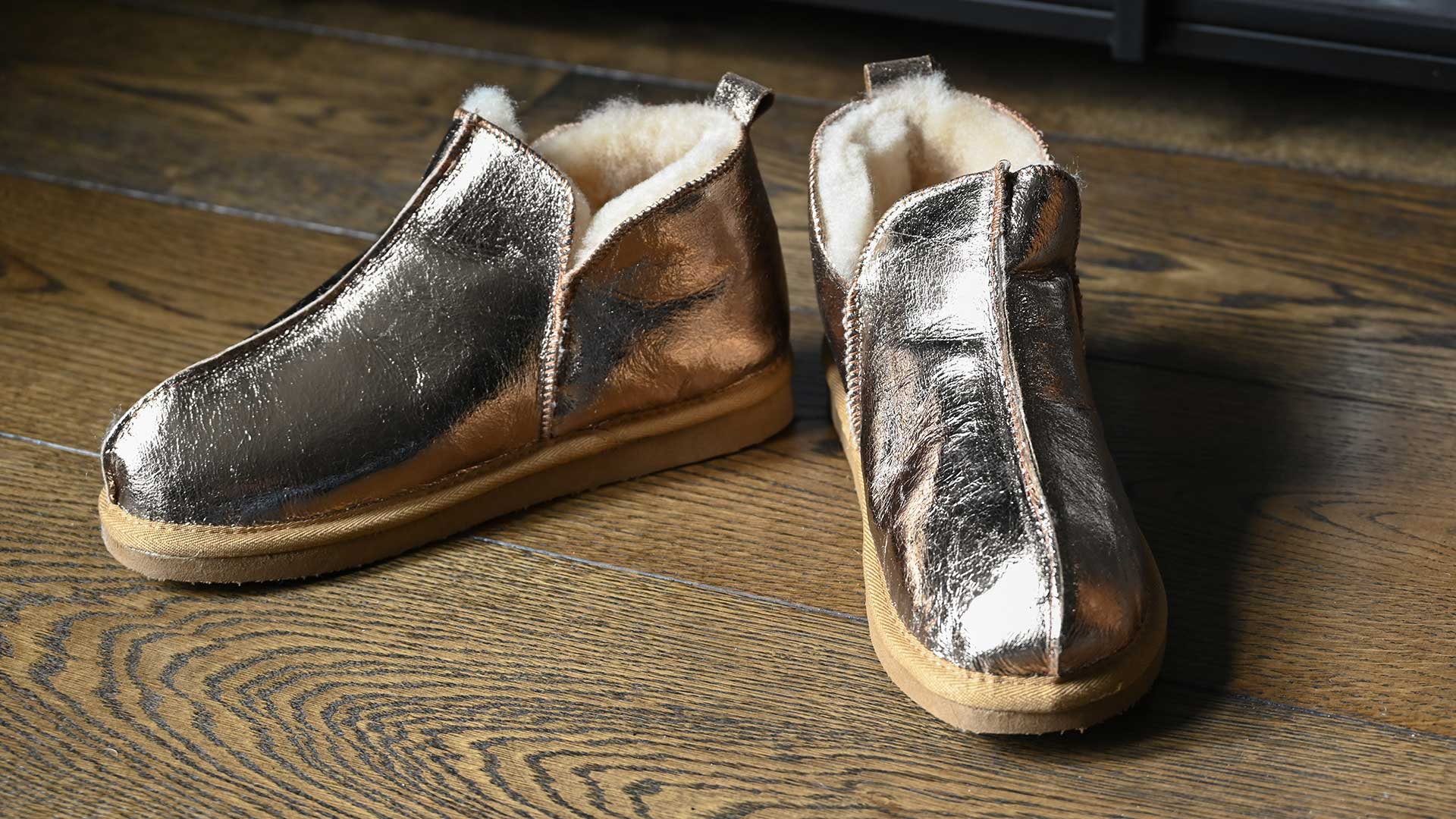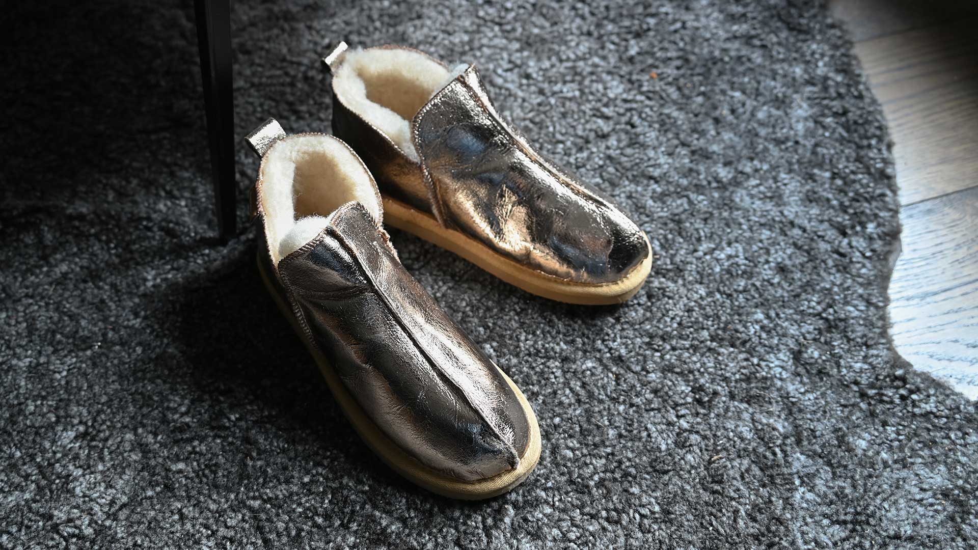 Bold, metallic gold women’s sheepskin slippers with a shock-absorbing tan, EVA sole. Available in sizes 37 – 41 (UK 4 – 7.5).