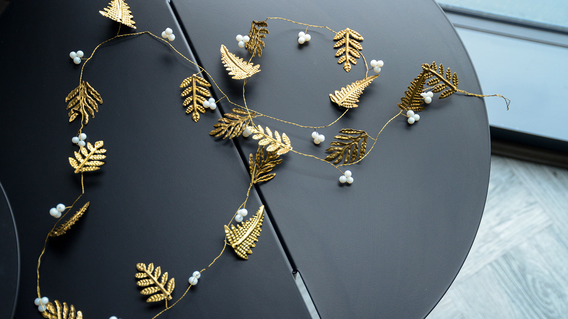 Gold coloured metal leaves and ivory coloured beads make this handmade garland an elegant choice for your Christmas look. A metal garland that adds intricate detailing to your festive scheme. Wrap it around a wreath, loop around a candle holder or neatly arrange in the branches of your Christmas tree.