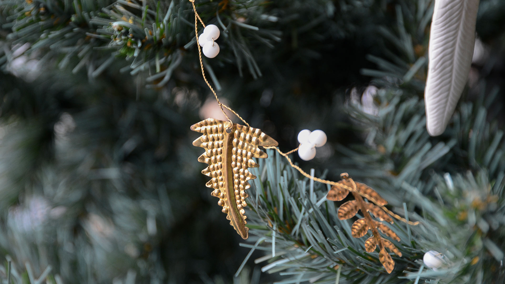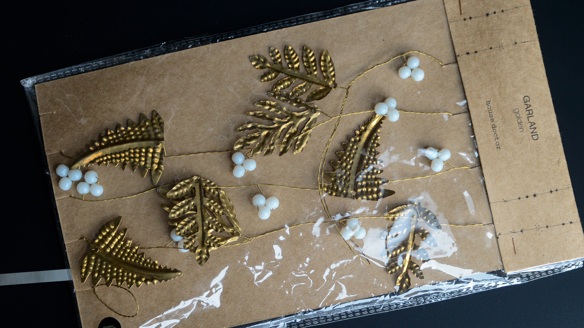A pretty brass Christmas garland of deep gold coloured metal leaves and ivory coloured beads. This handmade garland is an elegant choice for your Christmas look.